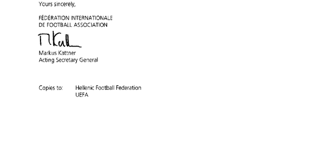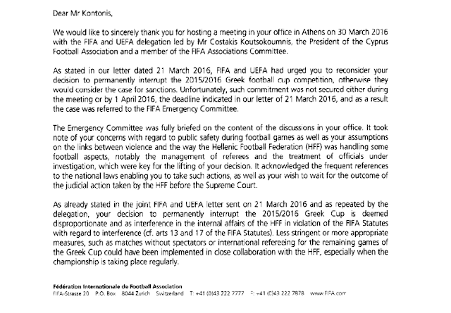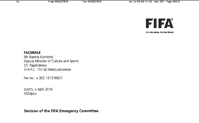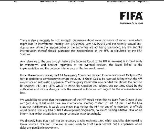 H επιστολή της FIFA που απειλεί με Grexit 05/04/2016 Δείτε την επιστολή της FIFA προς τον υφυπουργό Αθλητισμού για το θέμα του Grexit. H επιστολή προς τον Σταύρο Κοντονή αναφέρει: Αγαπητέ κ. Κοντονή, Θα θέλαμε να σας ευχαριστήσουμε ειλικρινώς για τη φιλοξενία της συνάντησης στο γραφείο σας στην Αθήνα στις 30 Μαρτίου 2016 με την αντιπροσωπεία της FIFA και της UEFA με επικεφαλής τον κ. Κωστάκη Κουτσοκούμνη, Πρόεδρο της Κυπριακής Ομοσπονδίας Ποδοσφαίρου και μέλος της Επιτροπής Ομοσπονδιών της FIFA. Όπως αναφερόταν στην επιστολή μας με ημερομηνία 21 Μαρτίου 2016, η FIFA και η UEFA σας κάλεσαν να αναθεωρήσετε την απόφασή σας να διακόψετε οριστικά τη διοργάνωση του ποδοσφαιρικού Κυπέλλου Ελλάδας 2015/2016, διαφορετικά θα εξέταζαν την υπόθεση για επιβολή κυρώσεων. Δυστυχώς, τέτοια δέσμευση δεν εξασφαλίστηκε είτε κατά τη διάρκεια της συνάντησης είτε έως την 1η Απριλίου 2016, προθεσμία που τέθηκε στην επιστολή μας της 21ης Μαρτίου 2016, και ως εκ τούτου η υπόθεση παραπέμφθηκε στην Επιτροπή Εκτάκτων Θεμάτων της FIFA. Η Επιτροπή Εκτάκτων Θεμάτων ενημερώθηκε πλήρως για το περιεχόμενο των συζητήσεων στο γραφείο σας. Έλαβε υπόψη τις ανησυχίες σας σχετικά με τη δημόσια ασφάλεια κατά τη διάρκεια ποδοσφαιρικών αγώνων καθώς και τις υποθέσεις που διατυπώσατε για τους δεσμούς μεταξύ της βίας και τον τρόπο που η Ελληνική Ποδοσφαιρική Ομοσπονδία (ΕΠΟ) χειριζόταν κάποιες πτυχές του ποδοσφαίρου, ιδιαίτερα τη διοίκηση των διαιτητών και την αντιμετώπιση αξιωματούχων που τελούν υπό έρευνα, οι οποίες ήταν βασικές για την άρση της απόφασής σας. Έλαβε γνώση των συχνών αναφορών στους εθνικούς νόμους που σας έδωσαν τη δυνατότητα να προβείτε σε τέτοιες ενέργειες, καθώς και την επιθυμία σας να αναμένετε την έκβαση της δικαστικής προσφυγής της ΕΠΟ ενώπιον του Ανωτάτου Δικαστηρίου (ΣτΕ). Όπως ήδη αναφέρθηκε στην κοινή επιστολή FIFA και UEFA που εστάλη στις 21 Μαρτίου 2016 και όπως επαναδιατυπώθηκε από την αντιπροσωπία, η απόφασή σας να διακόψετε οριστικά το Κύπελλο Ελλάδας 2015/2016 κρίνεται ως δυσανάλογη και ως παρέμβαση στις εσωτερικές υποθέσεις της ΕΠΟ σε παράβαση του Καταστατικού της FIFA σε ό, τι αφορά παρεμβάσεις (άρθ. 13 και 17 του Καταστατικού της FIFA). Λιγότερο αυστηρά και πιο κατάλληλα μέτρα, όπως διεξαγωγή αγώνων χωρίς θεατές ή διεθνής διαιτησία για τους εναπομείναντες αγώνες του Κυπέλλου Ελλάδας θα μπορούσαν να είχαν εφαρμοστεί σε στενή συνεργασία με την ΕΠΟ, κυρίως εφόσον το πρωτάθλημα διεξάγεται κανονικά. Υπάρχει επίσης η ανάγκη να διεξαχθούν συζητήσεις σε βάθος σχετικά με κάποιες διατάξεις νόμων οι οποίες θα μπορούσαν να οδηγήσουν σε παρεμβάσεις, ιδιαιτέρως του Ν. 2725/1999, του Ν. 4326/2015 και του προσφάτως ψηφισθέντα νόμου για την αντιμετώπιση του ντόπινγκ. Ενώ οι αρμοδιότητες των αρχών δεν τίθενται υπό αμφισβήτηση, οποιοσδήποτε νόμος και η ερμηνεία τούτου θα πρέπει να εγγυάται την ανεξαρτησία της ΕΠΟ, όπως ορίζεται από το Καταστατικό της FIFA. Οποιαδήποτε αναφορά στην υπόθεση που κατατέθηκε ενώπιον του Ανωτάτου Δικαστηρίου (ΣτΕ) από την ΕΠΟ είναι άσχετη καθώς θα μπορούσε εύκολα να αποσυρθεί, και καθώς ασχέτως της ενδεχόμενης απόφασης, τα θέματα που συνδέονται με την εφαρμογή και την ενδεχόμενη παρέμβαση του νόμου θα παραμένουν. Υπό αυτές τις συνθήκες, η Επιτροπή Εκτάκτων Θεμάτων της FIFA αποφάσισε να θέσει ως προθεσμία την 15η Απριλίου 2016 για την ανάκληση της απόφασης για την οριστική διακοπή του Κυπέλλου Ελλάδ