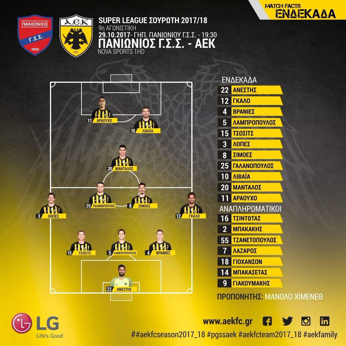 Αυτή είναι η ενδεκάδα της ΑΕΚ στο ματς με τον Πανιώνιο 29/10/2017 Ανακοινώθηκε η ενδεκάδα της ΑΕΚ για την αναμέτρηση με τον Πανιώνιο. Για το ματς της Νέας Σμύρνης ο Μανόλο Χιμένεθ θα κατεβάσει την ομάδα του με διάταξη 3-5-2. Ο Ισπανός τεχνικός θα παρατάξει την Ένωση με τον Ανέστη κάτω από τα δοκάρια. Η τριπλέτα της άμυνας θα αποτελείται από τους Βράνιες, Λαμπρόπουλο και Τσόσιτς, με τους Γκάλο (δεξιά) και Λόπες (αριστερά) στα άκρα. Στον άξονα το δίδυμο θα είναι οι Σιμόες και Γαλανόπουλος, με τον Μάνταλο να κινείται λίγο πιο μπροστά σε ελεύθερο ρόλο. Τέλος μπροστά θα αγωνιστούν οι Λιβάγια και Αραούχο. ΔΙΑΒΑΣΤΕ ΕΠΙΣΗΣ