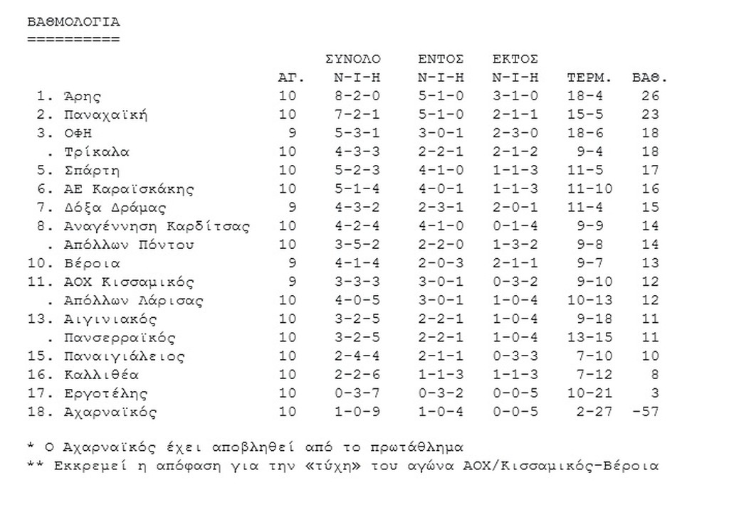 Άρης και Παναχαϊκή επιβεβαίωσαν τα προγνωστικά και νίκησαν στις έδρες τους, κόντρα σε Απόλλωνα Πόντου και Απόλλωνα Λάρισας αντίστοιχα, στο πλαίσιο της 10ης αγωνιστικής της Football League.