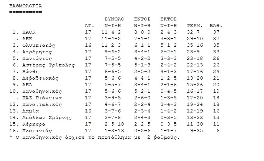 Βαθμολογία της Σούπερ Λιγκ – Ξανά στην κορυφή οι Δικέφαλοι, έχασε έδαφος ο Ατρόμητος 14/01/2018 Οι Δικέφαλοι συγκατοικούν ξανά στην κορυφή μετά τις νίκες της ΑΕΚ με 3-1 επί του ΠΑΣ και του ΠΑΟΚ με 3-0 στην Κέρκυρα. Όλα αυτά, βέβαια, σε αναμονή του αυριανού ματς του Ολυμπιακού με τη Λαμία, όπου οι ερυθρόλευκοι με νίκη θα προσπεράσουν ξανά. Έδαφος έχασε ο εκπληκτικός Ατρόμητος, αφού ο Παναιτωλικός στο ντεμπούτο του Δέλλα στον πάγκο του τον υποχρέωσε σε ήττα με 1-0 μέσα στο Περιστέρι. Δείτε την βαθμολογία: ΔΙΑΒΑΣΤΕ ΕΠΙΣΗΣ