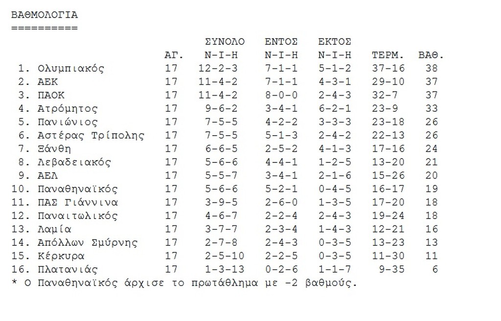 Βαθμολογία της Σούπερ Λιγκ – Επιστροφή στην κορυφή για Ολυμπιακό 15/01/2018 O Ολυμπιακός νίκησε 2-0 την Λαμία στο γήπεδο Καραϊσκάκη για την 17η αγωνιστική της Super League και παρέμεινε πρωτοπόρος στο πρωτάθλημα. Δείτε πώς διαμορφώθηκε η βαθμολογία: ΔΙΑΒΑΣΤΕ ΕΠΙΣΗΣ