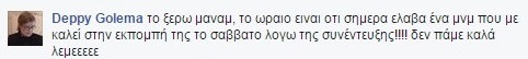 Η Σπυροπούλου καλεί Γκολεμά και στα social media γίνεται χαμός 07/01/2015 Ό Γρηγόρης Αρναούτογλου, κατά τη διάρκεια των χθεσινών “Καρντάσιανς”, δεν παρέλειψε να ρωτήσει την Κωνσταντίνα Σπυροπούλου για το περιστατικό που συνέβη στο Κολωνάκι με την Ντέπυ Γκολεμά. Έτσι, αφού …στόλισαν και οι δύο την τηλεκριτικό, σήμερα η Κωνσταντίνα Σπυροπούλου κάλεσε την Ντέπυ Γκολεμά στην εκπομπή της! «Το ωραίο είναι ότι σήμερα έλαβα ένα μήνυμα που με καλεί στην εκπομπή της το Σάββατο λόγω της συνέντευξης!!!! Δεν πάμε καλά λέμεεεε», έγραψε η τηλεκριτικός στον λογαριασμό της στο facebook. Βέβαια, χθες το βράδυ η Ντέπυ Γκολεμά δεν άφησε ασχολίαστη τη συνέντευξη της Κωνσταντίνας Σπυροπούλου. Από τα πυρά της δεν ξέφυγε ούτε ο Γρηγόρης Αρναούτογλου… ΔΙΑΒΑΣΤΕ ΕΠΙΣΗΣ