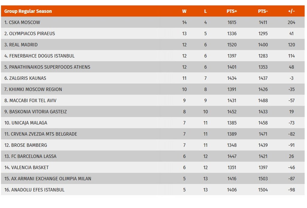 Σταθερά στην πρώτη θέση παρέμεινε η ΤΣΣΚΑ Μόσχας (14-4), η οποία έκανε περίπατο κόντρα στην Εφές (5-13) επικρατώντας με 110-79.
