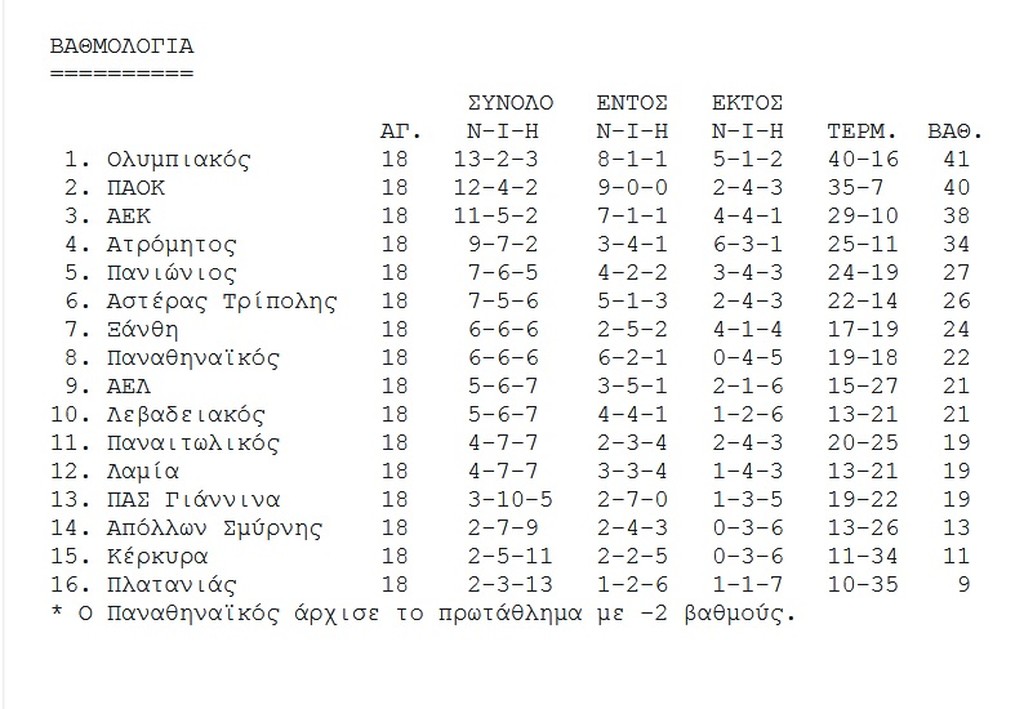Βαθμολογία της Σούπερ Λιγκ – Στον πόντο Ολυμπιακός, ΠΑΟΚ, στο -3 η ΑΕΚ 21/01/2018 Οι νίκες του Ολυμπιακού και του ΠΑΟΚ διατήρησαν τη διαφορά του ενός βαθμού υπέρ των ερυθρόλευκων στη βαθμολογία. Η ΑΕΚ υποχώρησε στο-3 μετά την ισοπαλία στη Λάρισα, πάντα τέταρτος ο Ατρόμητος που επίσης αναδείχθηκε ισόπαλος με τον ΠΑΣ στα Γιάννενα. ΔΙΑΒΑΣΤΕ ΕΠΙΣΗΣ
