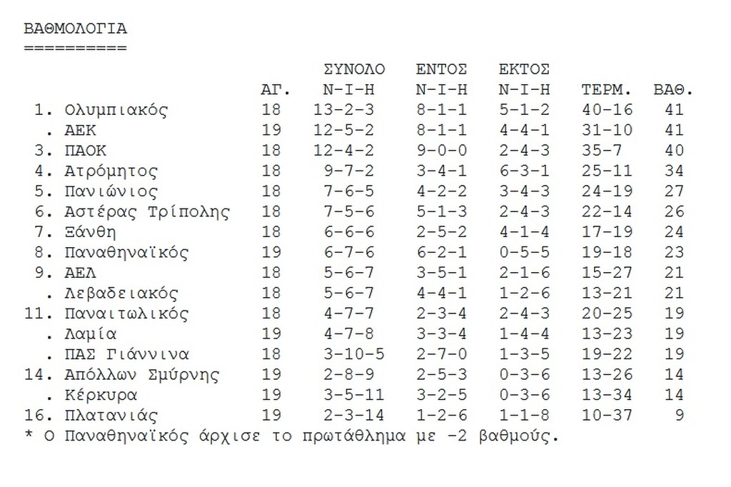 Βαθμολογία της Σούπερ Λιγκ – Έπιασε Ολυμπιακό η ΑΕΚ και περιμένει… 27/01/2018 Με τρεις αναμετρήσεις άνοιξε σήμερα η αυλαία της 19ης αγωνιστικής στην Super League. Στην Κέρκυρα η ομώνυμη ομάδα επικράτησε του Πλατανιά με 2-0, ενώ Απόλλων Σμύρνης και Παναθηναϊκός έμειναν στο 0-0 στη Ριζούπολη. Στο τελευταίο ματς της ημέρας, η ΑΕΚ επιβλήθηκε της Λαμίας με 2-0 και έπιασε τον Ολυμπιακό στην κορυφή. Στις αναμετρήσεις της 19ης αγωνιστικής σημειώθηκαν τα αποτελέσματα: Σάββατο 27 Ιανουαρίου Κέρκυρα-Πλατανιάς 2-0 Απόλλων Σμύρνης-Παναθηναϊκός 0-0 ΑΕΚ-Λαμία 2-0 Κυριακή 28 Ιανουαρίου 15:00 Παναιτωλικός-ΠΑΟΚ 17:15 Ξάνθη-Λεβαδειακός 17:15 Ατρόμητος-ΑΕΛ 17:15 Πανιώνιος-ΠΑΣ Γιάννινα 19:30 Αστέρας Τρίπολης-Ολυμπιακός ΔΙΑΒΑΣΤΕ ΕΠΙΣΗΣ