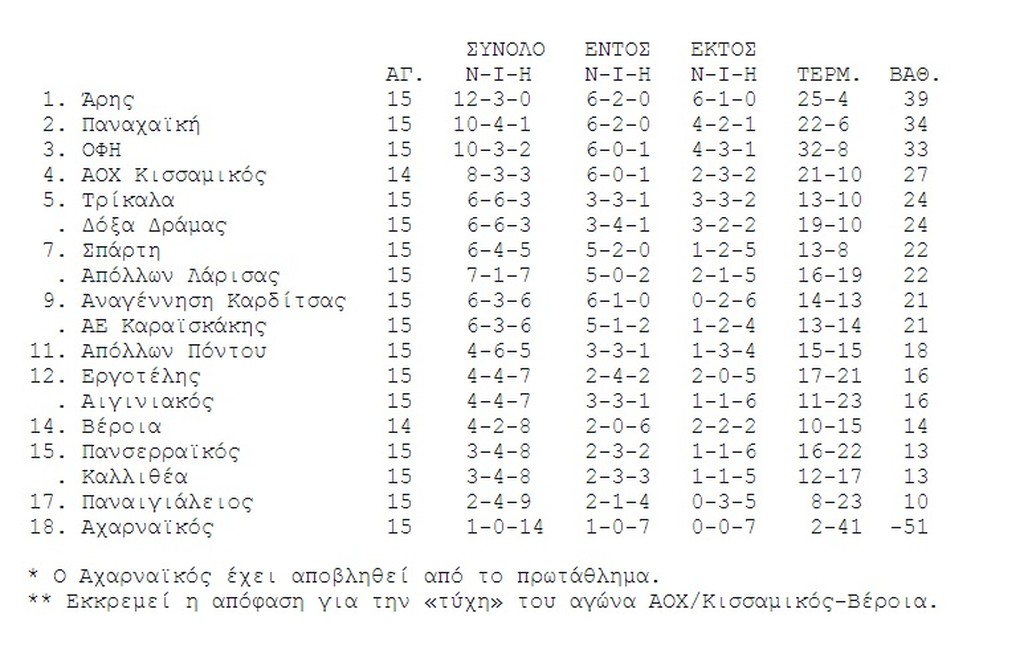 Τρένο ο Κισσαμικός, πάτησε και τα Τρίκαλα και βλέπει άνοδο 07/02/2018 Έχει πάρει φόρα ο Κισσαμικός και δεν σταματά με τίποτα. Οι Κρητικοί πανηγύρισαν την πέμπτη συνεχόμενη νίκη τους, αυτή τη φορά με 3-0 επί των Τρικάλων στα Περιβόλια Οι Χανιώτες ανέβασαν «στροφές» στο δεύτερο ημίχρονο, με αποτέλεσμα να σημειώσουν και τα τρία τέρματά τους. ΄Έτσι, έφτασαν στους 27 βαθμούς, εφτά πίσω από την 2η Παναχαϊκή και με ματς λιγότερο και επομένως μπορούν να βλέπουν άνοδο. Αντίθετα οι Θεσσαλοί έχασαν και άλλο έδαφος. Το πρώτο 45λεπτο δεν ήταν καλό, μιας και καμία από τις δύο ομάδες δεν έπιασε ρυθμό και έτσι οι καλές στιγμές μπροστά από τις δύο εστίες δεν υπήρχαν. Ωστόσο, αυτό άλλαξε στο β’ μέρος, με τους γηπεδούχους να δείχνουν την ανωτερότητά τους. Το 1-0 έγινε από τον Αποστολίδη στο 47′ με τον επιθετικό των Κρητικών να πιάνει δυνατό σουτ, μετά από σέντρα του Τόλι. ‘ Αυτό ήταν. Από εκεί και πέρα το γήπεδο… έγειρε, με τους Χανιώτες να εκμεταλλεύονται τα αμυντικά κενά της ομάδας των Τρικάλων και να ανεβάζουν το δείκτη του σκορ στο 2-0 με τον Χαλκιαδάκη στο 68′. Το κερασάκι στην τούρτα μπήκε στο 70′ από τον Λέο, ο οποίος διαμόρφωσε το τελικό αποτέλεσμα. Λίγο πριν το τελευταίο σφύριγμα Μάκος και Βρεττός είχαν μία αψιμαχία, με αποτέλεσμα ο πρώτος να τιμωρηθεί με κίτρινη κάρτα και ο δεύτερος με κόκκινη. ΑΟ Χανιά-Κισσαμικός (Γιώργος Πετράκης): Λαζαρίδης, Τόλι, Παντελάκης, Ζιούλης, Φουάσης, Σελινιωτάκης, Γκίνη, Ξύδας (77′ Βρεττός), Αποστολίδης (71′ Σάλιακας), Χαλκιαδάκης, Λέο (83′ Λεμονής). Τρίκαλα (Πέτρος Στοΐλας): Αποστολίδης, Πάνος, Λεάντρο Πίντο, Βέρτζος, Χιντζίδης, Μάκος, Τσιάρας (75′ Ανδρεόπουλος), Γροντής (62′ Ν’ Λουντούλου), Σαχινίδης, Γιαννιτσάνης, Ζγκούρη (75′ Ντακόλ). Τα αποτελέσματα της 15ης αγωνιστικής: Βέροια-Δόξα Δράμας 0-2 Απόλλων Λάρισας-Απόλλων Πόντου 1-0 Εργοτέλης-Αναγέννηση Καρδίτσας 1-0 Παναχαϊκή-Πανσερραϊκός 1-1 Αρης-Σπάρτη 1-0 Καλλιθέα-Αιγινιακός 0-0 ΑΕ Καραϊσκάκης-Παναιγιάλειος 2-0 ΑΟΧ Κισσαμικός-Τρίκαλα 3-0 Αχαρναϊκός-ΟΦΗ 0-3 (α.α.) ΔΙΑΒΑΣΤΕ ΕΠΙΣΗΣ