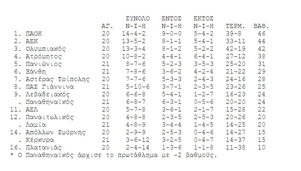 Η βαθμολογία της Σούπερ Λιγκ 10/02/2018 ην επιστροφή στις νίκες στους «Ζωσιμάδες», μετά από τρεις μήνες πανηγύρισε ο ΠΑΣ Γιάννινα που επικράτησε 2-1 του Παναθηναϊκού, οοποίος εξακολουθεί να μην έχει διπλό στο φετινό πρωτάθλημα. Λίγο νωρίτερα ο Πανιώνιος επικράτησε της Λαμίας με 1-0, ενώ Ξάνθη και Κέρκυρα ήρθαν ισόπαλες 1-1, με τους γηπεδούχους να ισοφαρίζουν στο 94′. Αναλυτικά οι αναμετρήσεις της 21ης αγωνιστικής: Ξάνθη-Κέρκυρα 1-1 Πανιώνιος-Λαμία 1-0 ΠΑΣ Γιάννινα-Παναθηναϊκός 2-1 Απόλλων Σμύρνης-Λεβαδειακός 11/2 ΑΕΚ-Αστέρας Τρίπολης 11/2 Παναιτωλικός-Πλατανιάς 11/2 Ατρόμητος-Ολυμπιακός 11/2 ΠΑΟΚ-ΑΕΛ 12/2 ΔΙΑΒΑΣΤΕ ΕΠΙΣΗΣ