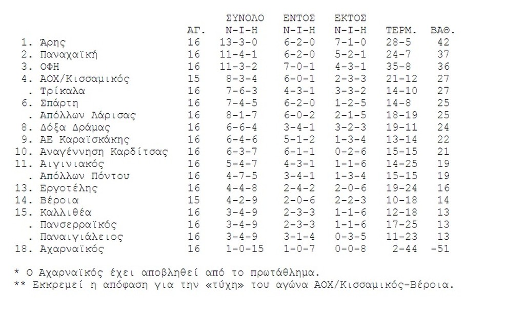 Ο Απόλλων Λάρισας έβαλε φρένο στον ΑΟΧ/Κισσαμικό 12/02/2018 Ο Απόλλων Λάρισας σταμάτησε την ανοδική πορεία του ΑΟΧ/Κισσαμικού, νικώντας τον με 2-0 στο Αλκαζάρ, στην αναμέτρηση με την οποία ολοκληρώθηκε η 16η αγωνιστική της Football League. Ο Ανδρέου στο 11΄ και ο Μαυριάς στο 40΄ πέτυχαν τα γκολ της θεσσαλικής ομάδας, που έκανε το τέσσερα στα τέσσερα στα τελευταία ματς και ανέβηκε στην έκτη θέση της κατάταξης, ισόβαθμη με τη Σπάρτη. Απόλλων Λάρισας (Θεοδοσιάδης): Παϊτέρης, Κουρτεσιώτης (92′ Δημολιάς), Παπαζαχαρίας, Β. Ανδρέου, Αγρόδημος, Χατζής, Μαυριάς, Τσιλούλης, Κανούλας, Καρακατσάνης (67′ Σουλίδης), Κακάμης (73′ λ.τρ. Ιβανίδης). ΑΟΧ Κισσαμικός (Πετράκης): Λαζαρίδης, Ζιούλης, Φουάσης, Παντελάκης, Σάλιακας, Σελινιωτάκης, Γκίνη (77′ Τασιούλης), Αποστολίδης, Ξύδας, Χαλκιαδάκης, Λέο (61′ Νικόλτσης) Τα αποτελέσματα της 16ης αγωνιστικής: Παναιγιάλειος-Αχαρναϊκός 3-0 α.α. Πανσερραϊκός-Άρης 1-3 ΟΦΗ-Βέροια 3-0 Τρίκαλα-Καλλιθέα 1-0 Απόλλων Πόντου-ΑΕ Καραϊσκάκης 0-0 Αιγινιακός-Εργοτέλης 3-2 Αναγέννηση Καρδίτσας-Παναχαϊκή 1-2 Σπάρτη-Δόξα Δράμας 1-0 Απόλλων Λάρισας-ΑΟΧ/Κισσαμικός 2-0 ΔΙΑΒΑΣΤΕ ΕΠΙΣΗΣ
