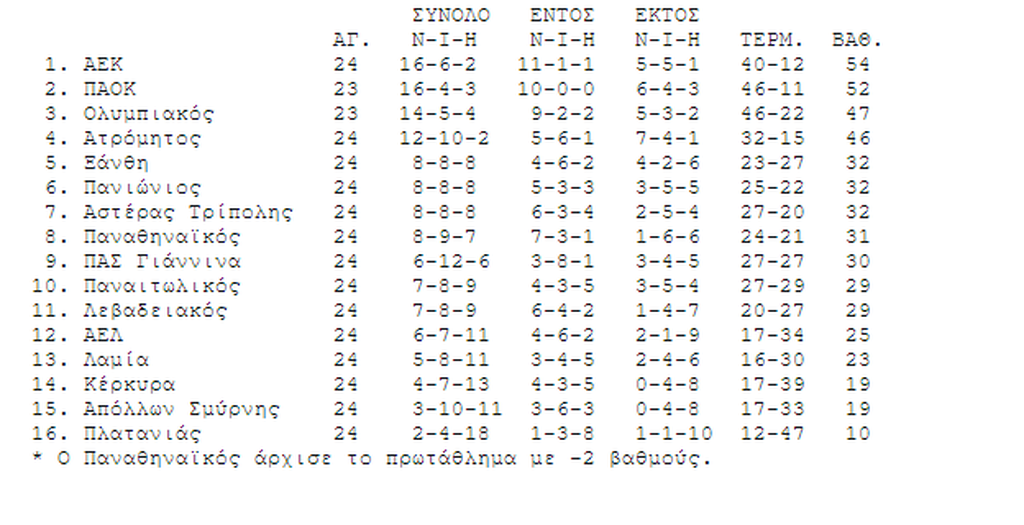 Η βαθμολογία της Σούπερ Λιγκ 05/03/2018 Με την αναμέτρηση Απόλλωνα-Παναιτωλικού 2-1 ολοκληρώθηκε η 24η αγωνιστική της Σούπερ Λιγκ. Μετά από αυτό το ματς η βαθμολογία έχει διαμορφωθεί ως εξής: Η Σούπερ Λιγκ μέχρι να τελεσιδικήσουν οι αποφάσεις για τα ματς Ολυμπιακού-ΑΕΚ και ΠΑΟΚ-Ολυμπιακού δεν προσμετρά το ματς της Τούμπας και δεν αφαιρεί τρεις βαθμούς από τον Δικέφαλο του Βορρά και τον Ολυμπιακό. Σύμφωνα με τις πρωτόδικες αποφάσεις στην πρώτη τετράδα η βαθμολογία έχει ως εξής: 1. ΑΕΚ 54 2. ΠΑΟΚ 49 3. Ολυμπιακός 47 4. Ατρόμητος 46 ΔΙΑΒΑΣΤΕ ΕΠΙΣΗΣ