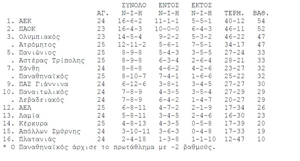 Σε πρώτο βαθμό ο Ολυμπιακός έχει -3 βαθμούς για το ματς με την ΑΕΚ, ενώ η αναμέτρηση ΠΑΟΚ-Ολυμπιακού έχει κατοχυρωθεί με 0-3 υπέρ των φιλοξενούμενων και από τον Δικέφαλο αφαιρέθηκαν 3 βαθμοί. Η διοργανώτρια δεν προσμετρά τις απαφάσεις μέχρι να τελεσιδικήσουν οι υποθέσεις.