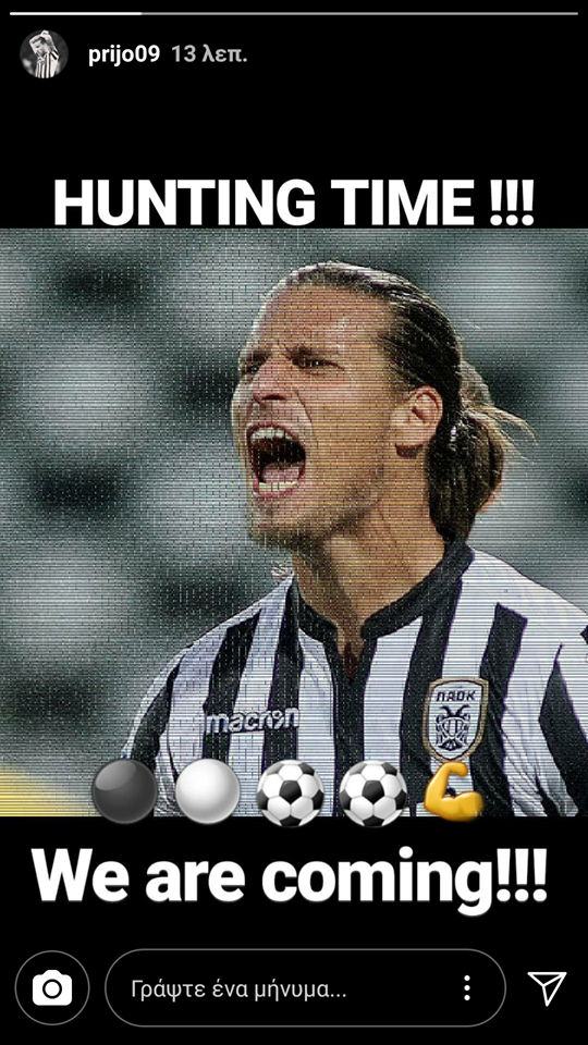 Πρίγιοβιτς: «Ώρα για κυνήγι. Ερχόμαστε» (ΦΩΤΟ) 30/03/2018 Με ανάρτησή του στο Instagram ο Αλεξάνταρ Πρίγιοβιτς έστειλε το δικό μήνυμα ανασύνταξης ενόψει της επανέναρξης των υποχρεώσεων του ΠΑΟΚ. «Ώρα για κυνήγι. Ερχόμαστε», έγραψε χαρακτηριστικά ο Σέρβος επιθετικός. ΔΙΑΒΑΣΤΕ ΕΠΙΣΗΣ