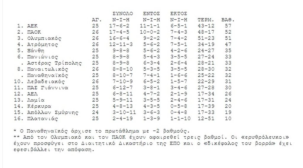 Βαθμολογία της Σούπερ Λιγκ – Προσπέρασε ξανά τον Ολυμπιακό ο ΠΑΟΚ 31/03/2018 Ολοκληρώθηκε το πρώτο πιάτο της 26ης αγωνιστικής στην Super League, με τον Ολυμπιακό να αφήνει δύο βαθμούς στη Λιβαδειά μετά το 1-1 κόντρα στην τοπική ομάδα. Στα άλλα ματς της ημέρας ο ΠΑΟΚ επικράτησε του Ατρομήτου με 2-0 και πέρασε ξανά στη 2η θέση, ενώι ο Παναιτωλικός πήρε τη νίκη επί του ΠΑΣ Γιάννινα με 1-0. Οι αναμετρήσεις της 26ης αγωνιστικής: Παναιτωλικός – ΠΑΣ Γιάννινα 1-0 Ατρόμητος – ΠΑΟΚ 0-2 Λεβαδειακός – Ολυμπιακός 1-1 Πανιώνιος – Ξάνθη 01/04 Απόλλων Σμύρνης – ΑΕΛ 01/04 Κέρκυρα – Λαμία 01/04 ΑΕΚ – Παναθηναϊκός 01/04 Αστέρας Τρίπολης – Πλατανιάς 02/04 ΔΙΑΒΑΣΤΕ ΕΠΙΣΗΣ