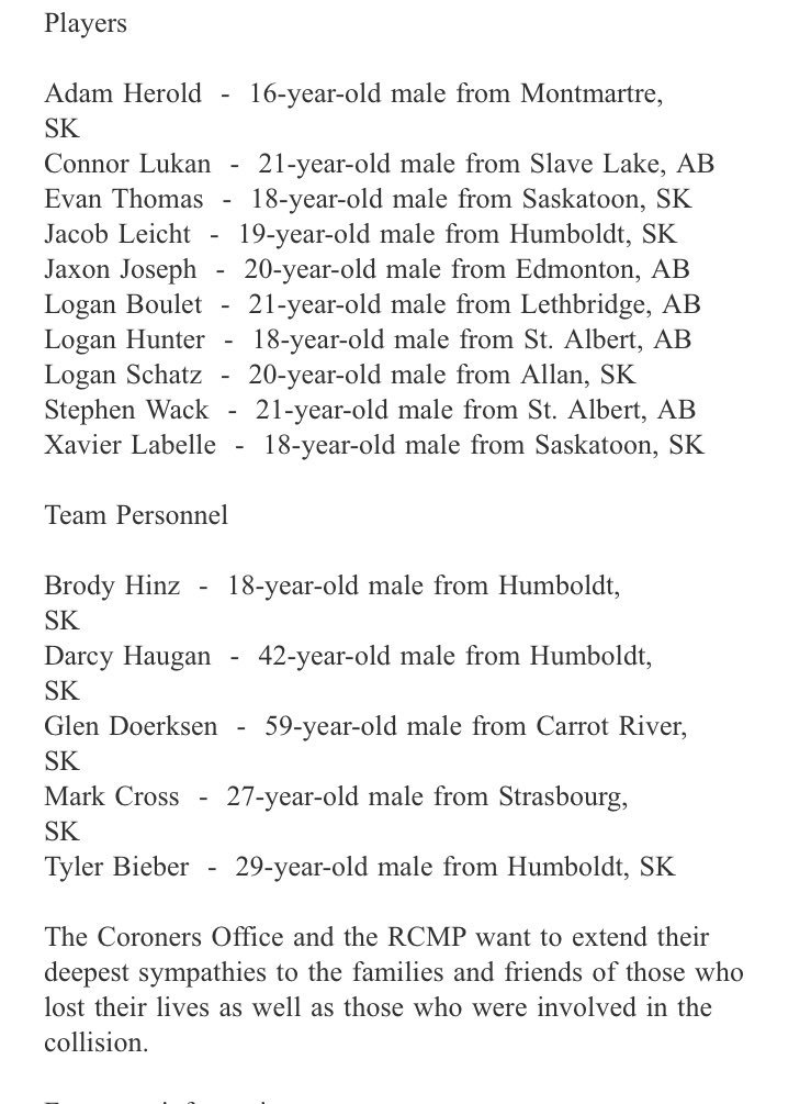 Η αποστολή των Broncos ταξίδευε για το πέμπτο ματς της σειράς με τους Nipawn Hawks, οι οποίοι είχαν το προβάδισμα με 3-1, δεν κατάφερε όμως να φτάσει στον προορισμό της. Αποτελούμενη από 24 αθλητές (ηλικίας 16 έως 21 ετών), η ομάδα του Χάμπολντ είδε να “σβήνουν” στην άσφαλτο δέκα παίκτες της, δύο προπονητές, δύο εργαζόμενοι (στατιστικολόγος και σπορτκάστερ), ενώ την ζωή του έχασε και ο οδηγός του λεωφορείου.