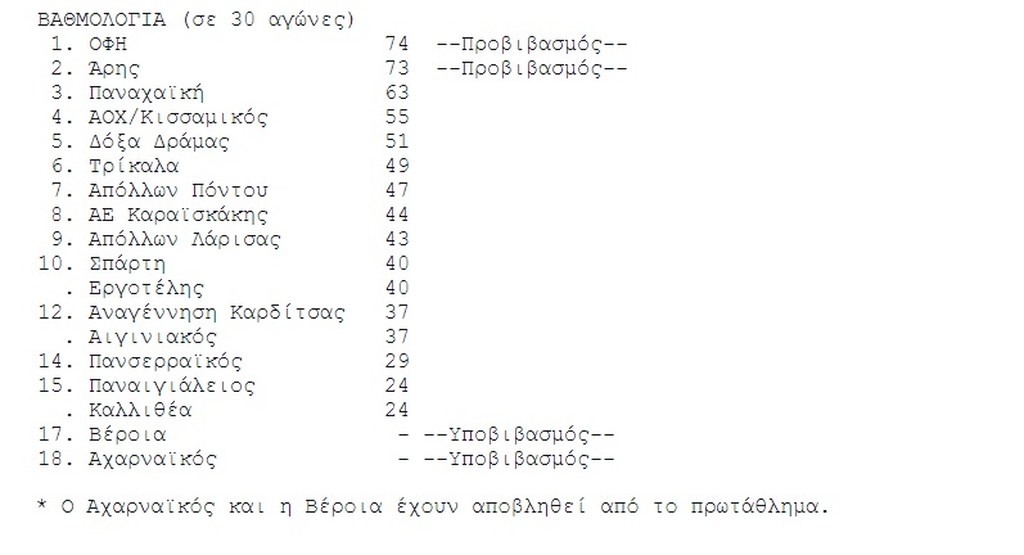 Το πανόραμα της Football League 06/05/2018 Οι αγώνες με στόχο την παραμονή στην κατηγορία συγκέντρωσαν το μεγαλύτερο ενδιαφέρον στην 30η ημέρα του πρωταθλήματος της Football League, με δεδομένο ότι την άνοδο έχουν ήδη εξασφαλίσει ΟΦΗ και Άρης. Τα αποτελέσματα της 30ης αγωνιστικής: Σπάρτη-Εργοτέλης 2-2 ΟΦΗ-Απόλλων Λάρισας 4-0 Αναγέννηση Καρδίτσας-Τρίκαλα 0-0 Αιγινιακός-Κισσαμικός 1-1 Παναιγιάλειος-Απόλλων Πόντου 1-2 Πανσερραϊκός-Καλλιθέα 1-1 Δόξα Δράμας-ΑΕ Καραϊσκάκης 0-0 Άρης-Αχαρναϊκός 3-0 (α.α.) Βέροια-Παναχαϊκή 0-3 (α.α.) ΔΙΑΒΑΣΤΕ ΕΠΙΣΗΣ