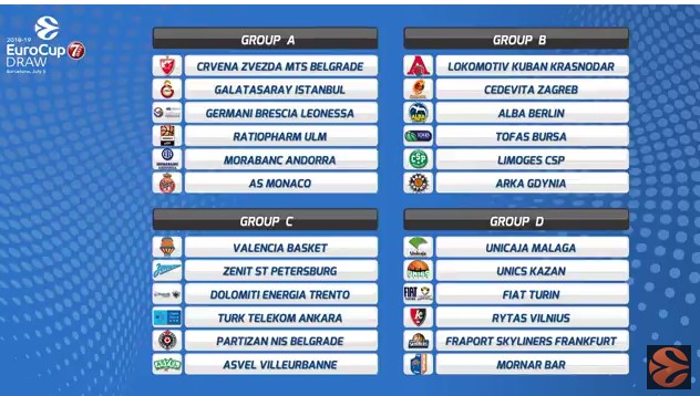 Οι όμιλοι του EuroCup (ΦΩΤΟ) 05/07/2018 Στη Βαρκελώνη έγινε η κλήρωση του νέου EuroCup, με τις 24 ομάδες να κατανέμονται σε 4 ομίλους των 6. H πρώτη φάση θα αρχίσει στις 2 Οκτωβρίου και θα ολοκληρωθεί στις 20 Δεκεμβρίου. Στη δεύτερη φάση προκρίνονται οι 4 πρώτες ομάδες από τον κάθε όμιλο, ενώ στο Top16 θα σχηματιστούν 4 όμιλοι των 4 ομάδων, από τις οποίες θα προκύψουν οι ομάδες των προημιτελικών. Αναλυτικά: A’ Όμιλος Ερυθρός Αστέρας Γαλατάσαραϊ Μπρέσια Ράτιοφαρμ Ουλμ ΜόραΜπανκ Ανδόρρα Μονακό Β’ Όμιλος Λοκομότιβ Κούμπαν Κράσνονταρ Τσεντεβίτα Ζάγκρεμπ Άλμπα Βερολίνου Τόφας Λιμόζ Γκντίνια Γ’ Όμιλος Βαλένθια Ζενίτ Αγ. Πετρούπολης Τρέντο Τουρκ Τέλεκομ Παρτίζαν Βιλερμπάν Δ’ Όμιλος Ουνικάχα Μάλαγα Ούνιξ Καζάν FΙAT Τορίνο Λιέτουβος Ρίτας Φράπορτ Σκαϊλάιντερ Φράνκφουρτ Μόρναρ Μπαρ ΔΙΑΒΑΣΤΕ ΕΠΙΣΗΣ