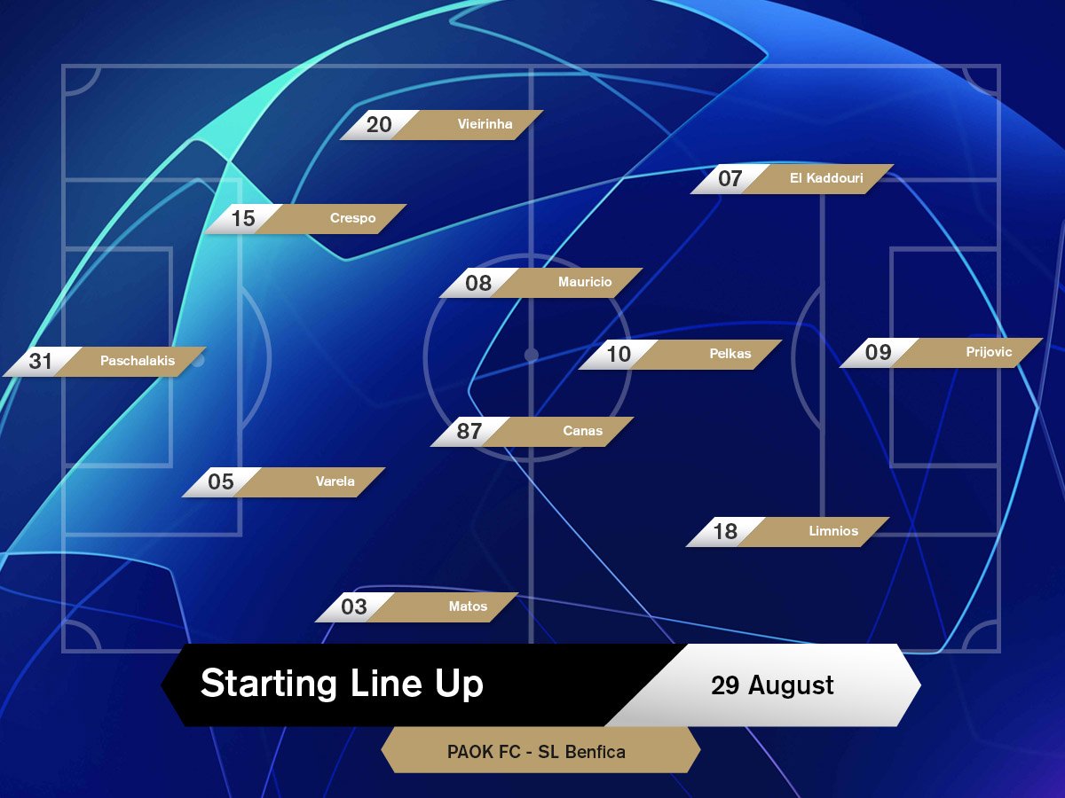 LIVE: ΠΑΟΚ-Μπενφίκα 1-4 Τελικό 29/08/2018 Λήξη του ματς. Για μια ακόμα φορά ο ΠΑΟΚ δεν μπόρεσε να κάνει την υπέρβαση έχοντας πάρει εκτός έδρας ισοπαλία 1-1 σε ματς Τσάμπιονς Λιγκ και θα συνεχίσει στο Γιουρόπα. Δύο λεπτά οι καθυστερήσεις. 87′ Κεφαλιά του Σάκχοφ, σε κόρνερ ο Βλαχοδήμος. 86′ Γύρισμα του Πέλκα, ο Βλαχοδήμος βρήκε την μπάλα με τα ακροδάχτυλα και παραχώρησε κόρνερ. 85′ Zοάο Φέλιξ αντί Σεφέροβιτς. 85′ Κίτρινη στον Σάκχοφ. 76′ Κόκκινη κάρτα στον Μάτος, που έχοντας κίτρινη από το πρώτο ημίχρονο έκανε ένα σκληρό μαρκάρισμα και είδε τη δεύτερη. 75′ Αλλαγή για την Μπενφίκα. Στη θέση του Πίτσι ο Ζίβκοβιτς. Και για τον ΠΑΟΚ ο Ακπόμ στη θέση του Ελ Καντουρί. 75′ Κίτρινη στον Πέλκα. Έχει πέσει τελείως ο ρυθμός. 69′ Οι γηπεδούχοι ζητούν πέναλτι σε μαρκάρισμα στον Ουάρντα μέσα στην περιοχή, ο διαιτητής δεν δείχνει κάτι. 63′ Σεμέδο αντί Σάλβιο και Σάκχοφ αντί Κάνιας. 60′ Σουτ του Μάτος με γροθιές ο Βλαχοδήμος. 51′ Κεφαλιά του Πρίγιοβιτς μετά από κόρνερ η μπάλα στο οριζόντιο δοκάρι του Βλαχοδήμου. Η υπόθεση πρόκριση τελείωσε οριστικά και αμετάκλητα. Ο ΠΑΟΚ θα συνεχίσει στο Europa League. 49′ Εκτελεί ο Σάλβιο και 1-4. Ο Πασχαλάκης ακούμπησε την μπάλα με το πόδι, αλλά αυτή κατέληξηξε στα δίχτυα. 48′ Νέο πέναλτι για την Μπενφίκα. Ο Βαρέλα αγκάλιασε τον Ζαρντέλ και ο Μπριχ σωστά έδωσε την εσχάτη των ποινών και την κίτρινη στον παίκτη του Δικεφάλου. Σέντρα στο β’ μέρος. 46′ Ο Ουάρντα στη θέση του Λημνιού για τον ΠΑΟΚ. Λήξη του α’ ημιχρόνου. Ο ΠΑΟΚ έκανε το ιδανικό ξεκίνημα, αλλά στη συνέχεια προδόθηκε από τα αμυντικά του λάθη με αποτέλεσμα η Μπενφίκα να σκοράρει τρεις φορές και να είναι πολύ κοντά στην πρόκριση. Δύο τα λεπτά των καθυστερήσεων. 41′ Σουτ του Βιεϊρίνια η μπάλα κόντραρε κι έφτασε στην αγκαλιά του Βλαχοδήμου. 40′ Γκολ! Η Μπενφίκα κάνει το 1-3 με σουτ του Πίτσι και πλέον η υπόθεση πρόκριση για τον ΠΑΟΚ απομακρύνεται… Υποφέρει αμυντικά ο ΠΑΟΚ κι ενώ πλέον είναι υποχρεωμένος να ρισκάρει. 36′ Τριπλή ευκαιρία για την Μπενφίκα! Ο Σεφέροβιτς πλάσαρε ο Πασχαλάκης έσωσε, στη συνέχεια ο γκολκίπερ του ΠΑΟΚ έδιωξε και στον πλασέ του Γκριμάλντο και τέλος ο Σεφέροβιτς πήρε την κεφαλιά κι έστειλε την μπάλα άουτ. 35′ Μεγάλη επέμβαση του Βλαχοδήμου σε κεφαλιά του Μάτος. Έδιωξε σε κόρνερ. 34′ Κίτρινη και στον Ζαρντέλ. 33′ Κίτρινη κάρτα στον Μαουρίτσιο. Προσπαθούν να συνέλθουν στον ΠΑΟΚ από την αναπάντεχη εξέλιξη. Ο Δικέφαλος θέλει πλέον δύο γκολ για να προκριθεί και φυσικά να μην δεχθεί άλλο. 25′ Εκτελεί ο Σάλβιο εύστοχα και δίνει το προβάδισμα στην Μπενφίκα με 1-2. 24′ Τραγικό λάθος του Πασχαλάκη, που ανατρέπει τον Σέρβι και καταλογίζεται πέναλτι. Αρχικά προσπάθησε να προλάβει την μπάλα ο γκολκίπερ του ΠΑΟΚ, έκλεψε ο αντίπαλος και στη συνέχεια τον ανέτρεψε. 20′ Ισοφάριση για την Μπενφίκα! Ο Ζαρντέλ με κεφαλιά στέλνει την μπάλα στα δίχτυα του Πασχαλάκη και τώρα έχουμε σκορ παράτασης. 13′ ΓΚΟΟΟΛΛΛ ΓΙΑ ΤΟΝ ΠΑΟΚ! Ο Βιεϊρίνια πέρασε στον Μαουρίτσιο, αυτός έσπασε την μπάλα στον Πρίγιοβιτς που προ κενής εστίας έκανε το 1-0. 8′ Κίτρινη κάρτα στον Μάτος. 5′ Μεγάλη ευκαιρία για τον ΠΑΟΚ. Οι παίκτες του “έκρυψαν” την μπάλα και τελικά το σουτ του Λημνιού, αφού κόντραρε πέρασε δίπλα από το δοκάρι του Βλαχοδήμου. Πολύ δυνατά έχει μπει στο ματς ο ΠΑΟΚ και πιέζει από το πρώτο δευτερόλεπτο. 3′ Νέο δυνατό φάουλ του Σέρβι στον Βιεϊρίνια. 2′ Ο Πέλκας εκτελεί το φάουλ, η μπάλα στο τείχος. Πρώτη επίθεση στο ματς και ο Αλ