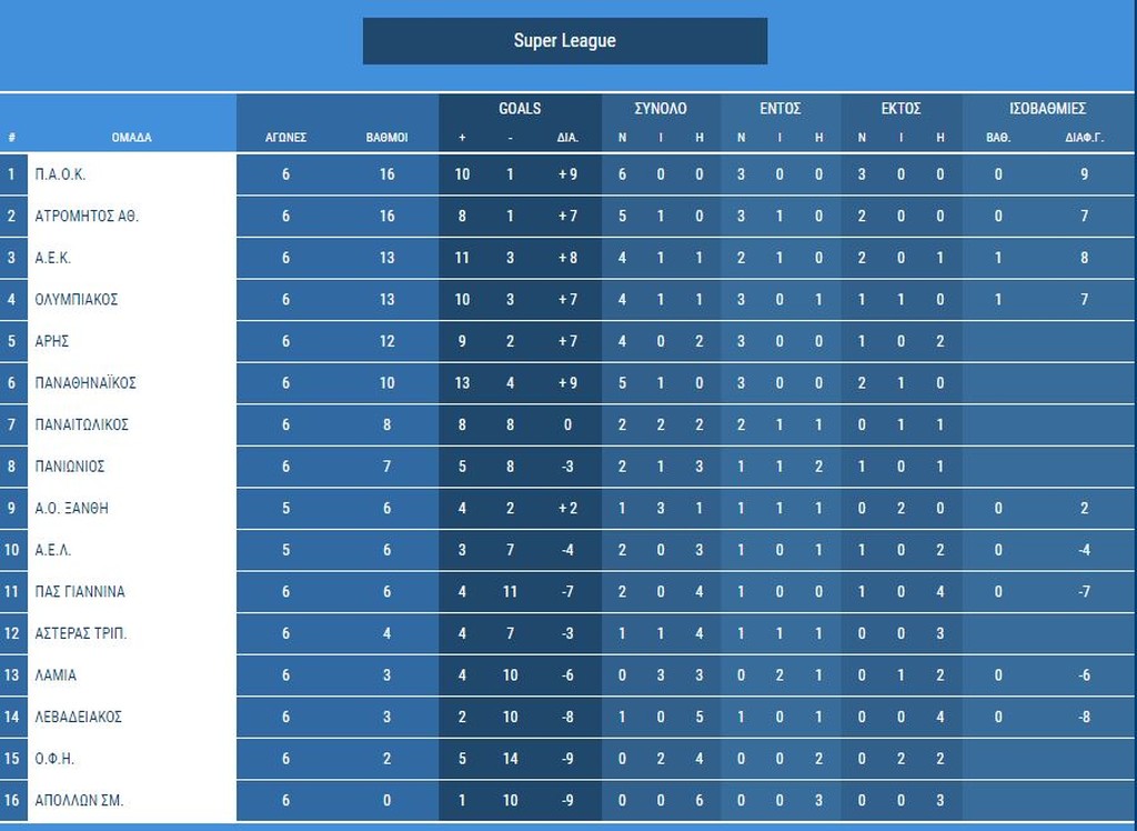Η βαθμολογία της Σούπερ Λιγκ 07/10/2018 Στην κορυφή της βαθμολογίας της Σούπερ Λιγκ παραμένει ο ΠΑΟΚ, ο οποίος έχει κάνει το απόλυτο, αλλά κουβαλά την τιμωρία -2 από πέρυσι. Συγκάτοικος στο ρετιρέ είναι ο Ατρόμητος, που νίκησε τον ΠΑΣ Γιάννινα και παρέμεινε αήττητος. Τρίτη είναι πλέον η ΑΕΚ, μαζί με τον Ολυμπιακό, μετά την ισοπαλία του ντέρμπι έχοντας από 13 πόντους. Ο Παναθηναϊκός υποχώρησε στην 6η θέση, αλλά έχει την ποινή των -6. Στην τελευταία θέση χωρίς βαθμό μένει ο Απόλλων Σμύρνης, ενώ νίκη δεν έχουν πανηγυρίσει ακόμα οι ΟΦΗ και Λαμία. Η 6η αγωνιστική ολοκληρώνεται αύριο Δευτέρα με το Ξάνθη-ΑΕΛ. ΒΑΘΜΟΛΟΓΙΑ ΔΙΑΒΑΣΤΕ ΕΠΙΣΗΣ