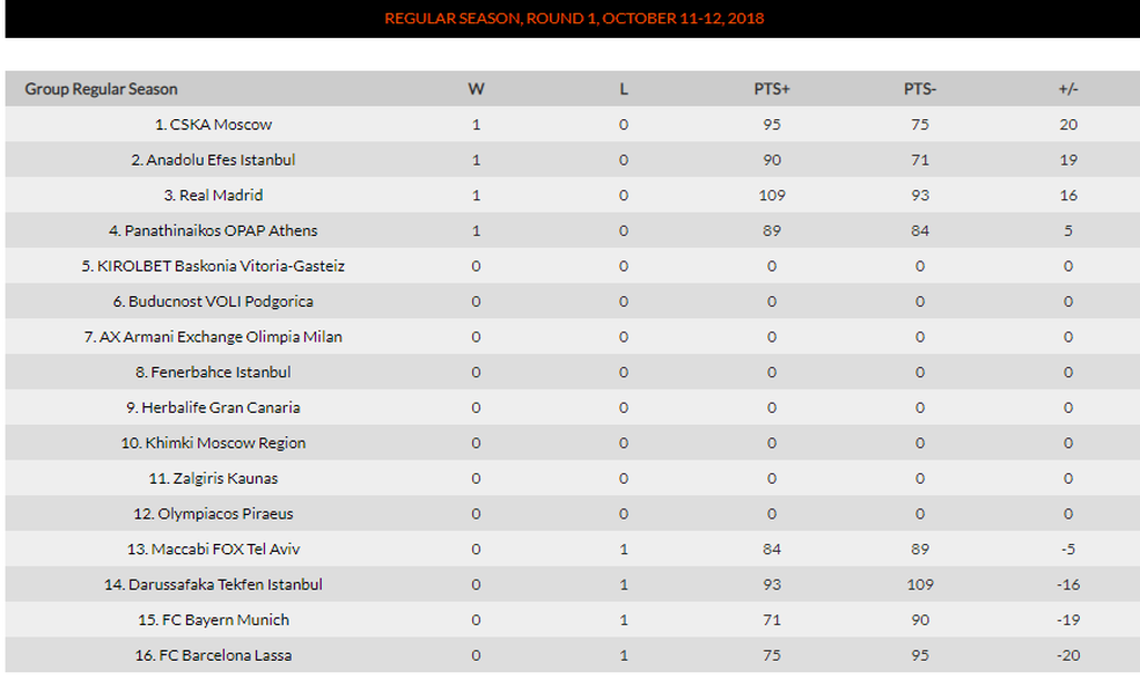 Το πανόραμα της Εuroleague 11/10/2018 Πρεμιέρα έκανε απόψε η Euroleague. Με το δεξί ξεκίνησε ο Παναθηναϊκός ΟΠΑΠ που με τον Λοτζέσκι να κάνει σούπερ ματς έκαμψε την αντίσταση της Μακάμπι στο ΟΑΚΑ. Στη Μόσχα η ΤΣΣΚΑ εμφανίστηκε αγριεμένη και διέλυσε την Μπαρτσελόνα, ενώ και η Εφές έδειξε τα δόντια της με επιβλητικό διπλό στο Μόναχο. Επιβλητική ήταν και η Ρεάλ που έκανε φύλλο και φτερό στη Μαδρίτη την Νταρουσάφακα. Τα αποτελέσματα της Πέμπτης (11/10): Παναθηναϊκός ΟΠΑΠ-Μακάμπι Τελ Αβίβ (Ισραήλ) 89-84 ΤΣΣΚΑ Μόσχας (Ρωσία)-Μπαρτσελόνα (Ισπανία) 95-75 Μπάγερν Μονάχου (Γερμανία)-Αναντολού Εφές (Τουρκία) 71-90 Ρεάλ Μαδρίτης (Ισπανία)-Νταρουσάφακα (Τουρκία) 109-93 Το πρόγραμμα της Παρασκευής (12/10): Κίμκι (Ρωσία)-Ολυμπιακός 20:00 Novasports 1HD Μπουντούτσνοστ (Μαυροβούνιο)-Αρμάνι Μιλάνο (Ιταλία) 19:45 Novasports 4HD Ζαλγκίρις Κάουνας (Λιθουανία)-Μπασκόνια (Ισπανία) 20:00 Novasports 3HD Φενερμπαχτσέ (Τουρκία)-Γκραν Κανάρια (Ισπανία) 20:45 Novasports 2HD Η ΒΑΘΜΟΛΟΓΙΑ ΔΙΑΒΑΣΤΕ ΕΠΙΣΗΣ