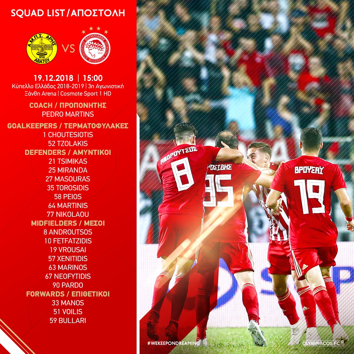 Φουλ αλλαγές και με Πάρντο στην αποστολή ο Ολυμπιακός 18/12/2018 Από πολλούς παίκτες της δεύτερης ομάδας αποτελείται η αποστολή του Ολυμπιακού για το ματς με τον Άρη Αβάτου, που είναι το τελευταίο για τον πέμπτο όμιλο του Κυπέλλου. Ο Πέδρο Μαρτίνς αποφάσισε να αφήσει εκτός σχεδόν όλους τους βασικούς για ξεκούραση, ενώ μάλιστα έκανε και την έκπληξη, καθώς πήρε στην αποστολή τον παραγκωνισμένο Φελίπε Πάρντο. Συγκεκριμένα, ο Πορτογάλος τεχνικός πήρε μαζί του οκτώ παίκτες της «ερυθρόλευκης» Ακαδημίας και συγκεκριμένα τους Τζολάκη, Πέιο, Μαρτίνη, Ξενιτίδη, Μαρίνο, Νεοφυτίδη, Βοΐλη και Μπουλάρι, ενώ οι άλλοι δώδεκα είναι οι Χουτεσιώτης, Τσιμίκας, Μιράντα, Μασούρας, Τοροσίδης, Νικολάου, Ανδρούτσος, Φετφατζίδης, Βρουσάι, Πάρντο και Μάνος. ΔΙΑΒΑΣΤΕ ΕΠΙΣΗΣ