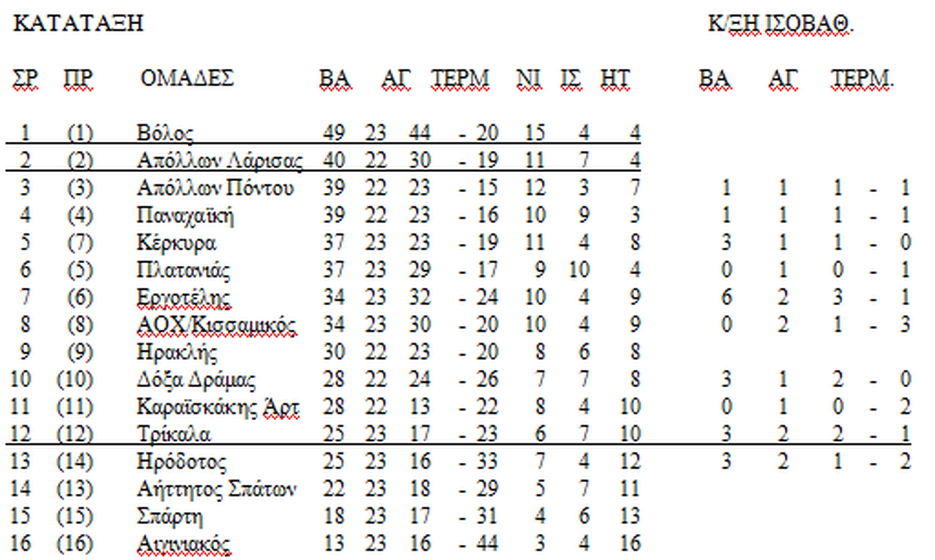 Football League (23η αγωνιστική): Ο Βόλος κράτησε τον Πλατανιά σε απόσταση – Αποτελέσματα και βαθμολογία 23/03/2019 Στο ντέρμπι της 23ης αγωνιστικής στη Football League που έγινε στα Περιβόλια των Χανίων, ο Πλατανιάς και ο Βόλος αναδείχθηκαν ισόπαλοι χωρίς τέρματα (0-0). Αποτέλεσμα που βολεύει περισσότερο τους φιλοξενούμενους, οι οποίοι διατηρούν απόσταση ασφαλείας στην κορυφή της βαθμολογίας. Επιστροφή στις νίκες και μάλιστα με ανατροπή για την Κέρκυρα, κόντρα στον Εργοτέλη (2-1) και οι Φαίακες απέχουν πλέον ένα τρίποντο από τη δεύτερη θέση. Τα Χανιά πέρασαν τρένο από την έδρα του ουραγού Αιγινιακού (0-4) και διατηρούν τις λίγες ελπίδες ανόδου. Νίκη χρυσάφι στη μάχη για την παραμονή, πήρε ο Ηρόδοτος, επικρατώντας στην Νέα Αλικαρνασσό των Τρικάλων (1-0). Αναλυτικά το πρόγραμμα της αγωνιστικής: Σάββατο 23 Μαρτίου Πλατανιάς-Βόλος 0-0 Σπάρτη-Αήττητος Σπάτων (3-0 α.α.) Ηρόδοτος-Τρίκαλα 1-0 (50′ Αργκιλέσι) Κέρκυρα-Εργοτέλης 2-1 (32′ Μότα, 55′ Σιατραβάνης/ 1′ Έφορντ) Αιγινιακός-ΑΟΧ/Κισσαμικός 0-4 (28′ Κάσσος, 45′ Αποστολόπουλος, 58′, 75′ Αρναρέλλης) Κυριακή 24 Μαρτίου Απόλλων Πόντου-Παναχαϊκή (15:00) Δόξα Δράμας-Απόλλων Λάρισας (15:00) Καραϊσκάκης Άρτας-Ηρακλής (15:00) ΒΑΘΜΟΛΟΓΙΑ ΔΙΑΒΑΣΤΕ ΕΠΙΣΗΣ
