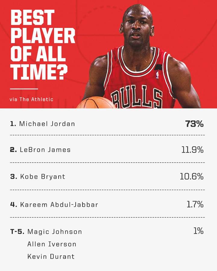 Οι παίκτες του ΝΒΑ ψήφισαν: Αυτός είναι ο καλύτερος όλων των εποχών (ΦΩΤΟ) 09/04/2019 Στην έρευνα που έκανε το «The Athletic» μεταξύ των παικτών του ΝΒΑ, υπήρχε και το… μεγάλο ερώτημα: Ποιος είναι ο καλύτερος παίκτης όλων των εποχών; Ο Μάικλ Τζόρνταν έσπασε τα κοντέρ! Συγκεκριμένα ο θρύλος του παγκόσμιου μπάσκετ μάζεψε το 73% των ψήφων και άφησε… πολύ πίσω του τον ΛεΜπρόν Τζέιμς, ο οποίος είχε μόλις το 11,9% των προτιμήσεων. Στην 3η θέση βρέθηκε ο Κόμπι Μπράιαντ με 10,6% ενώ ακολούθησαν οι Καρίμ Αμπντούλ Τζαμπάρ (1,7%), Μάτζικ Τζόνσον (1%), Άλεβ Άιβερσον (1%) και Κέβιν Ντουράντ (1%). ΔΙΑΒΑΣΤΕ ΕΠΙΣΗΣ