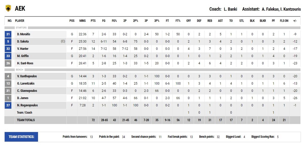 Από την άλλη, η ΑΕΚ πάλεψε όσο μπορούσε αλλά ήταν εμφανώς επηρεασμένη από τα πολλά προβλήματα. Είναι χαρακτηριστικό ότι ο Μπάνκι είχε δέκα διαθέσιμους παίκτες, ανάμεσα τους τους Ρογκαβόπουλο και Μωραϊτη, ο οποίος ξεκίνησε βασικός.