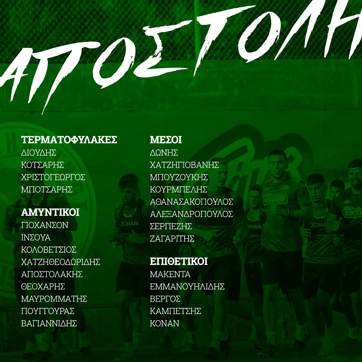 Αναλυτικά η αποστολή των πράσινων: Διούδης, Κότσαρης, Χριστογεώργος, Μπότσαρης, Γιόχανσον, Ινσούα, Κολοβέτσιος, Χατζηθεοδωρίδης, Αποστολάκης, Θεοχάρης, Μαυρομμάτης, Πούγγουρας, Βαγιαννίδης, Δώνης, Χατζηγιοβάνης, Μπουζούκης, Κουρμπέλης, Αθανασακόπουλος, Αλεξανδρόπουλος, Σερπεζής, Ζαγαρίτης, Μακέντα, Εμμανουηλίδης, Βέργος, Καμπετσής, Κόναν.