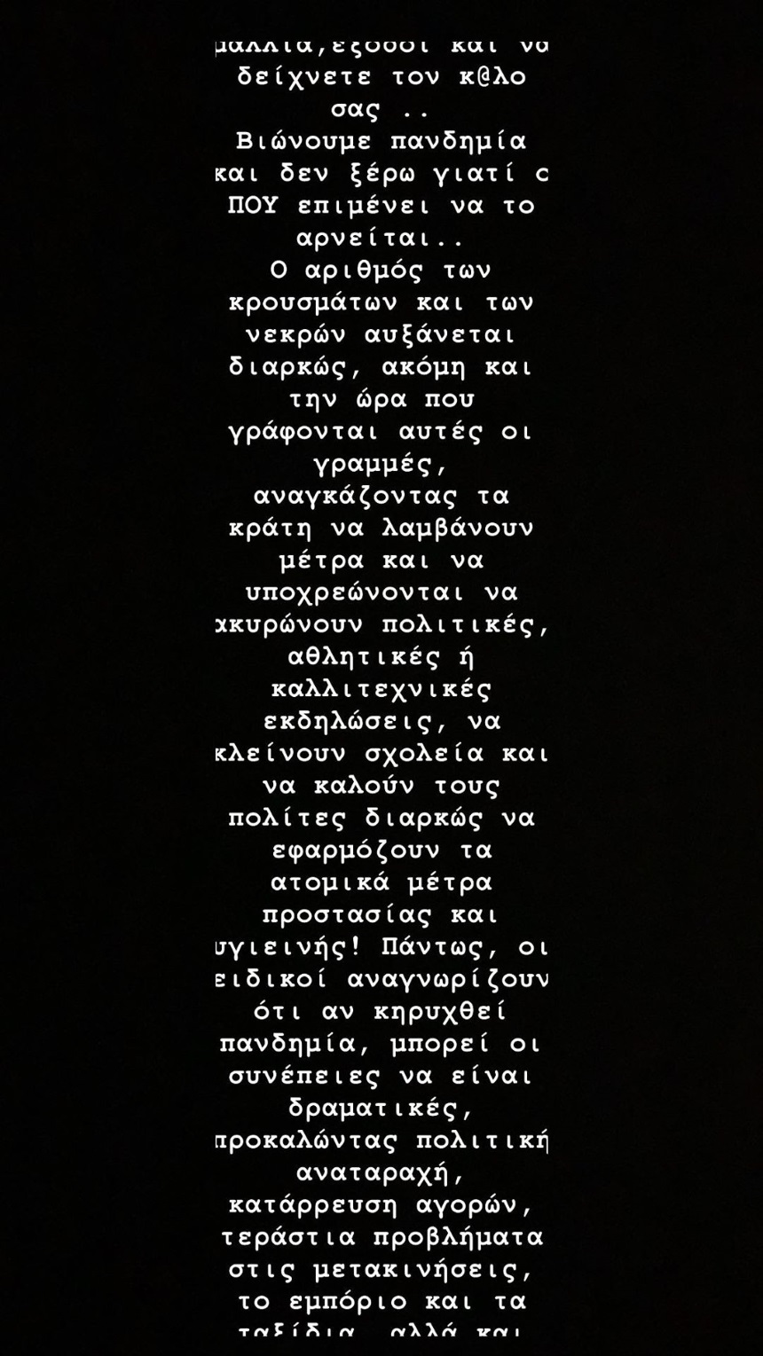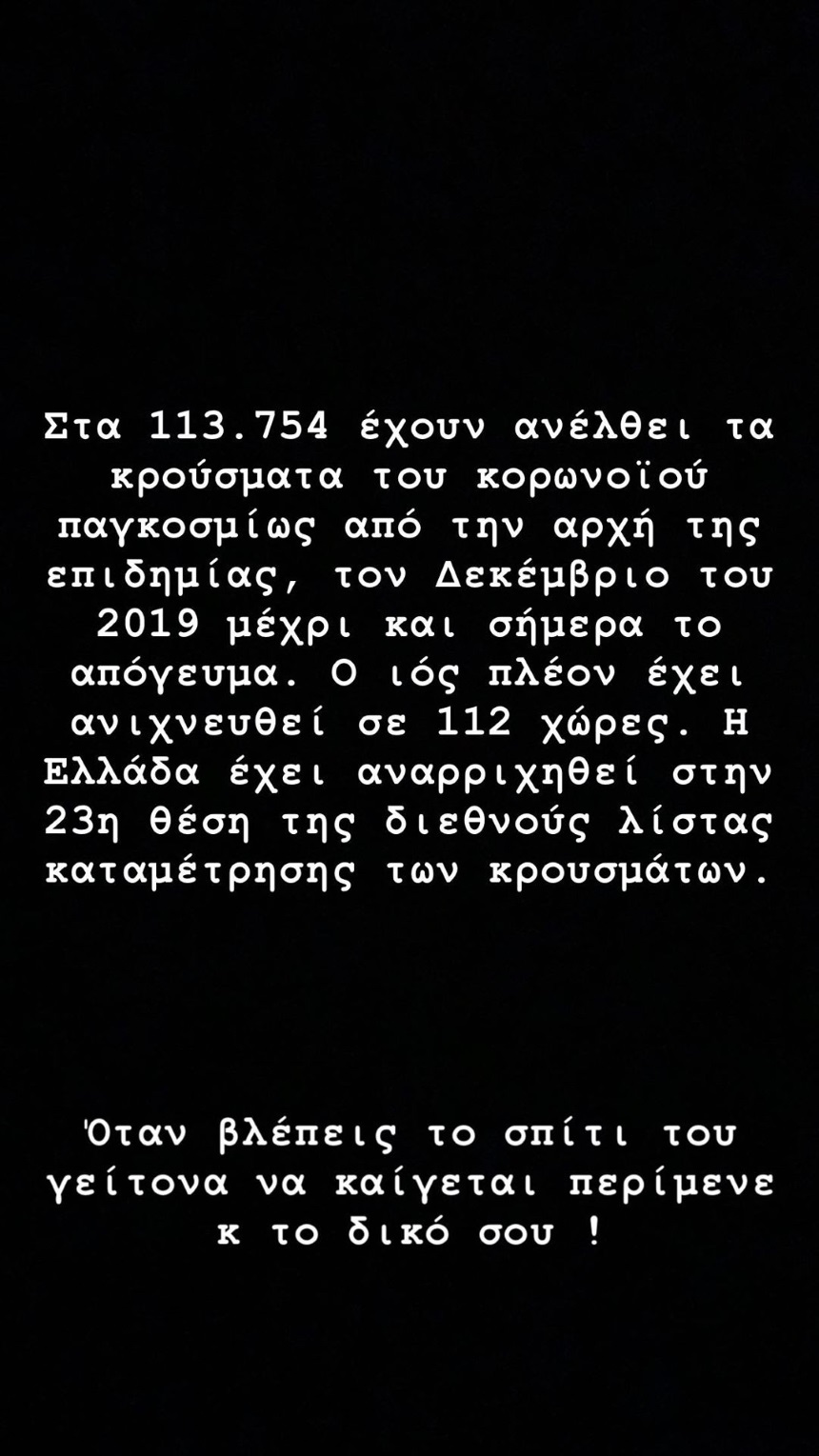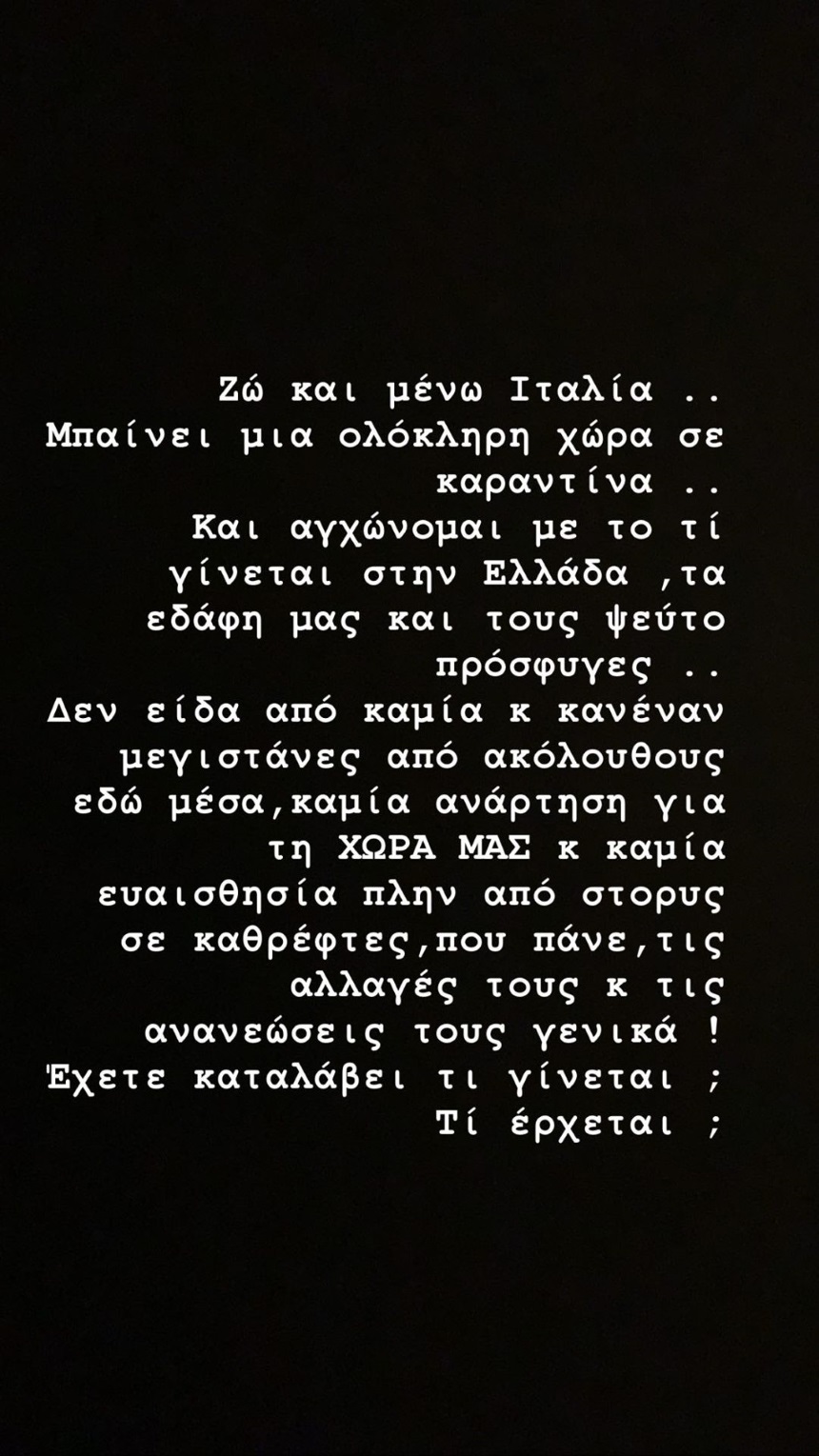 Ζέτα Θεοδωροπούλου: To ξέσπασμα για τον κορονοϊό από την Ιταλία όπου ζει! (ΦΩΤΟ) 11/03/2020 Η Ζέτα Θεοδωροπούλου μένει μόνιμα στην Ιταλία λόγω των επαγγελματικών υποχρεώσεων του συζύγου της Παναγιώτη Ταχτσίδη. Η πρώην παρουσιάστρια έχει ανησυχήσει πολύ με την κατάσταση που επικρατεί σε πολλές χώρες του πλανήτη με την ραγδαία εξάπλωση του κορονοϊού και κυρίως τους αλλεπάλληλους θανάτους που έχει προκαλέσει στην γειτονική χώρα. Η σύζυγος του γνωστού ποδοσφαιριστή έκανε μερικές αναρτήσεις στον προσωπικό της λογαριασμό στο Instagram ξεσπώντας για την αδιαφορία μερικών για όσα γίνονται. Αναφέρθηκε μεταξύ άλλων στον τεράστιο αριθμό των κρουσμάτων στην Ιταλία και συνεπώς τις δύσκολες ημέρες που βιώνουν, την ανησυχία της για τα γεγονότα που συμβαίνουν στην Ελλάδα ενώ δεν έκρυψε τον έντονο εκνευρισμό της με εκείνους και εκείνες που εξακολουθούν να δείχνουν τα κάλλη τους μέσα από τα social media. ΔΙΑΒΑΣΤΕ ΕΠΙΣΗΣ