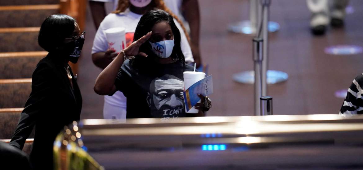 Στο Χιούστον, την πόλη όπου μεγάλωσε ο Φλόιντ, αμερικανικές σημαίες κυμάτιζαν κατά μήκος του δρόμου που οδηγεί στην εκκλησία Κρήνη της Δοξολογίας. Κάποιοι φορούσαν μπλουζάκια με το σύνθημα «Δεν μπορώ να αναπνεύσω», τα τελευταία λόγια του 46χρονου πριν αφήσει την τελευταία του πνοή στον δρόμο, ακινητοποιημένος κάτω από το γόνατο του αστυνομικού Ντέρεκ Σόβιν.