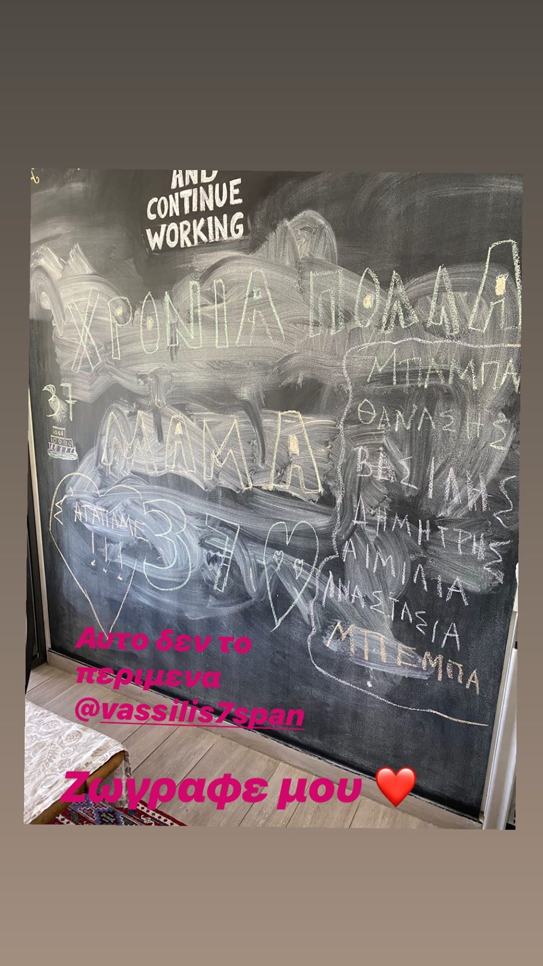 Σήμερα που έχει τα γενέθλιά της, ο σύζυγός της και τα μικρά της αγγελούδια ζωγράφισαν τον μαύρο τοίχο στο σπίτι τους με ευχές για αυτή την ξεχωριστή ημέρα! Όπως θα δεις, ο Βασίλης και τα παιδιά έγραψαν «Χρόνια πολλά μανούλα! Σ’ αγαπάμε!» αλλά και τα ονόματά τους. Η μικρή τους – η οποία γεννήθηκε πριν μερικούς μήνες – δεν έχει ακόμη όνομα και την φωνάζουν… μπέμπα!