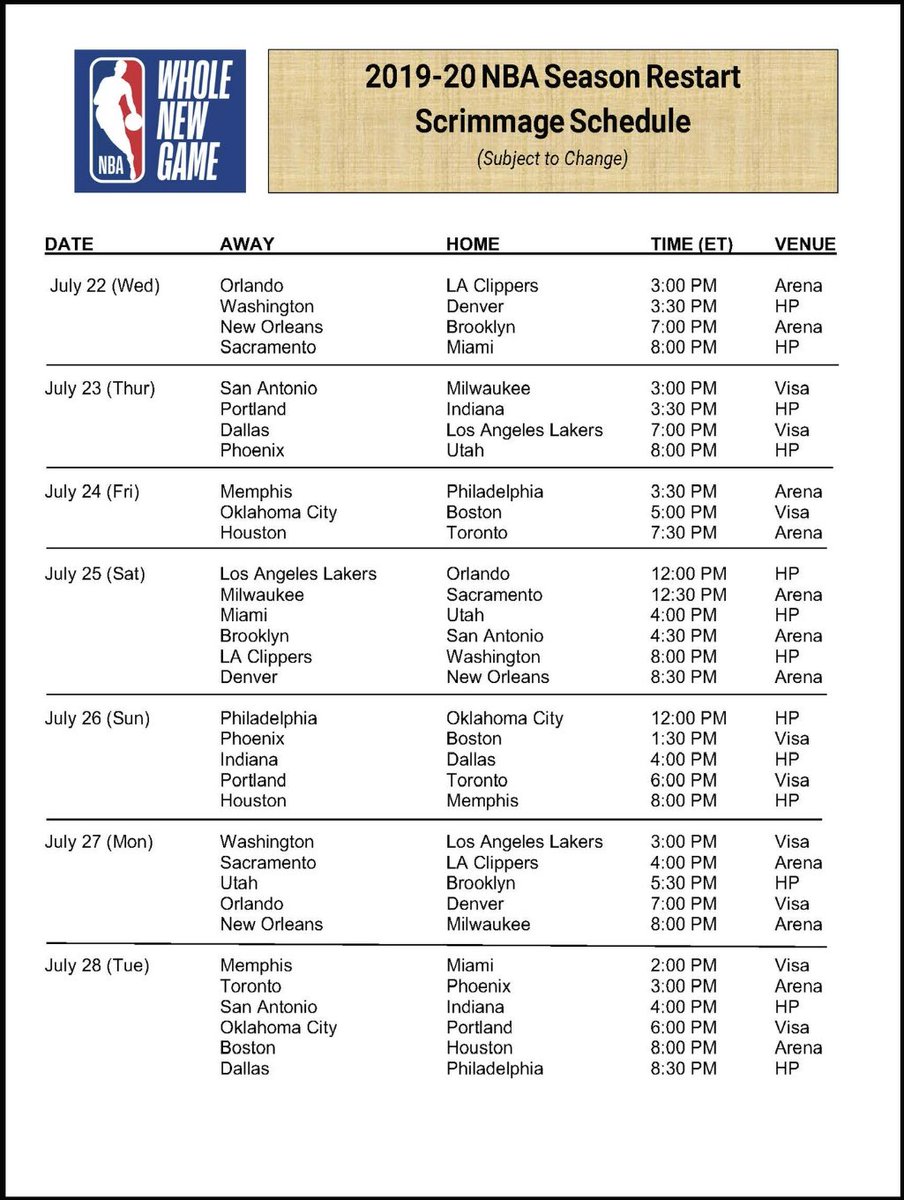 ΝΒΑ: Στις 22 Ιουλίου τα πρώτα φιλικά προετοιμασίας (ΦΩΤΟ) 05/07/2020 Το ΝΒΑ έχει καταλήξει πως στις 22 Ιουλίου θα μπορέσουν να διεξαχθούν τα πρώτα φιλικά των ομάδων στο Ορλάντο ενόψει της επανεκκίνησης του εφετινού πρωταθλήματος. Οι ομάδες θα μπορέσουν να δώσουν τρία φιλικά ματς, προκειμένου να αποκτήσουν αγωνιστικό ρυθμό πριν την επανέναρξη, η οποία έχει προγραμματιστεί για τις 30 Ιουλίου. Ήδη, έχουν γίνει γνωστά και τα ζευγάρια των πρώτων φιλικών. Στις 22 Ιουλίου θα γίνουν τα εξής ματς: Ορλάντο Μάτζικ-Λος Άντζελες Κλίπερς Ουάσινγκτον Ουίζαρντς-Ντένβερ Νάγκετς Νιού Όρλεανς Πέλικανς-Μπρουκλιν Νετς Σακραμέντο Κινγκς-Μαϊάμι Χιτ Το πρώτο φιλικό των Μιλγουόκι Μπακς αναμένεται στις 23 Ιουλίου απέναντι στους Σαν Αντόνιο Σπερς. Το πρόγραμμα των φιλικών: ΔΙΑΒΑΣΤΕ ΕΠΙΣΗΣ