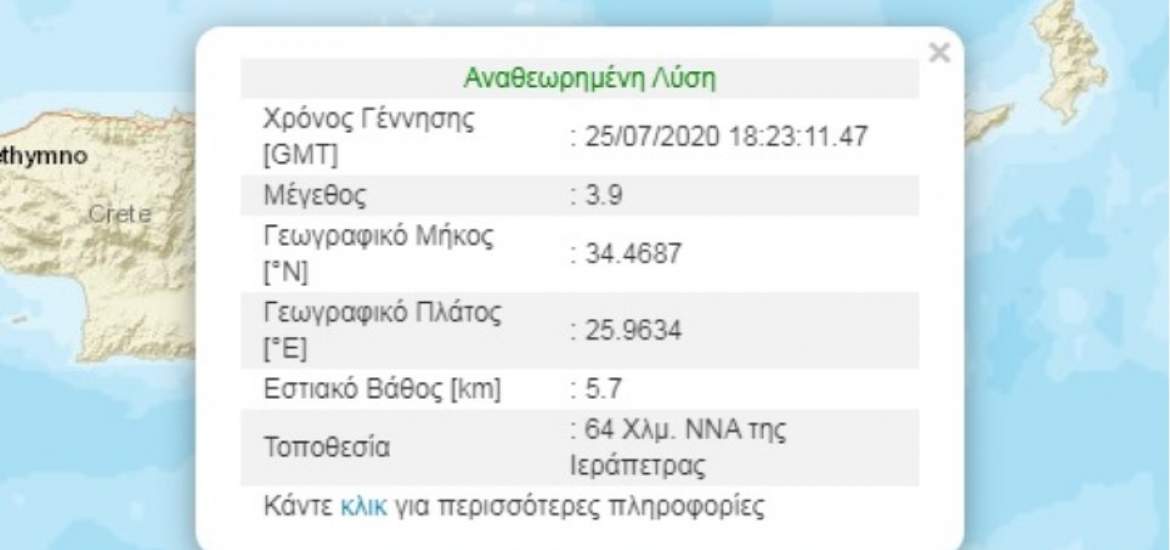 Σεισμός ανοιχτά της Κρήτης 25/07/2020 Σεισμική δόνηση 3,9 βαθμών της κλίμακας Ρίχτερ σημειώθηκε ανοιχτά της Κρήτης το βράδυ του Σαββάτου. Σύμφωνα με την μέτρηση του Γεωδυναμικού Ινστιτούτο του Εθνικού Αστεροσκοπείου Αθηνών, ο σεισμός σημειώθηκε 64 χλμ. νοτιοανατολικά της Ιεράπετρας, σε εστιακό βάθος 5,7 χλμ. ΔΙΑΒΑΣΤΕ ΕΠΙΣΗΣ