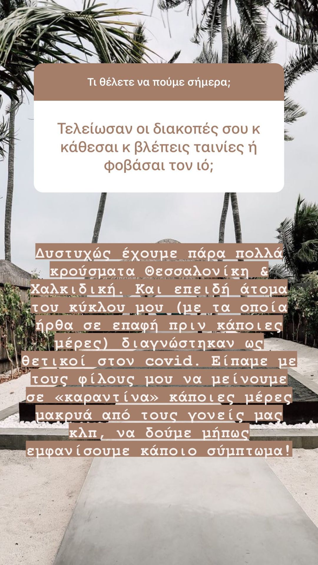 Έτσι, η γνωστή επιχειρηματίας από την Θεσσαλονίκη βρίσκεται σε καραντίνα και αποφεύγει να βγει έξω, ώστε να μην κολλήσει κάποιον, σε περίπτωση που έχει προσβληθεί και εκείνη από τον φονικό ιό. Όπως ανέφερε η ίδια η Ιωάννα στα Instagram Stories της: «Δυστυχώς έχουμε πάρα πολλά κρούσματα σε Θεσσαλονίκη και σε Χαλκιδική. Και επειδή άτομα του κύκλου μου (με τα οποία ήρθα σε επαφή πριν κάποιες ημέρες) διαγνώστηκαν ως θετικοί στον Covid, είπαμε με τους φίλους μου να μείνουμε σε «καραντίνα» κάποιες ημέρες, μακριά από τους γονείς μας κλπ, να δούμε μήπως εμφανίσουμε κάποιο σύμπτωμα».