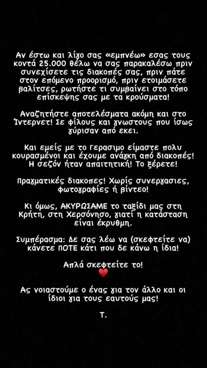 «Και εμείς με τον Γεράσιμο είμαστε πολύ κουρασμένοι  και έχουμε ανάγκη από διακοπές. Κι όμως ακυρώσαμε το ταξίδι μας στην Κρήτη τη Χερσόνησο γιατί η κατάσταση είναι έκρυθμη» έγραψε μεταξύ άλλων η Τόνια.