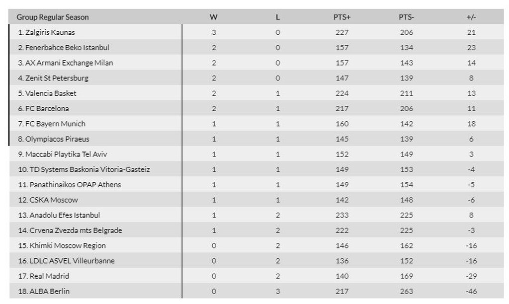 Η βαθμολογία της EuroLeague: Στην κορυφή η απίθανη Ζαλγκίρις 13/10/2020 Δύο ακυρώσεις αγώνων είχαμε κατά την πρώτη δόση της 3ης Αγωνιστικής της Euroleague. Συγκεκριμένα ακυρώθηκαν οι αναμετρήσεις Βιλερμπάν- Παναθηναϊκού και Μπασκόνια- Ζενίτ. Κατά τ’ άλλα το 3/3 στη φετινή Euroleague έκανε η Ζαλγκίρις που πέρασε και από την έδρα του Ερυθρού Αστέρα. Είχαν προηγηθεί τα διπλά στο ΣΕΦ επί του Ολυμπιακού και στην Μόσχα επί της Χίμκι. Επίσης η Εφές (πάλι αγωνίστηκε χωρίς τον Λάρκιν) έσπασε το ρόδι καθώς πέρασε με χαρακτηριστική άνεση από το Βερολίνο κόντρα στην Άλμπα. Τέλος η Μπαρτσελόνα (χωρίς τον Μίροτιτς) πέτυχε μεγάλη νίκη στην έδρα της Βαλένθια. Η οποία υποχρεώθηκε στην πρώτη φετινή της ήττα. 3η ΑΓΩΝΙΣΤΙΚΗ Ερυθρός Αστέρας- Ζαλγκίρις Κάουνας 69-75 Άλμπα Βερολίνου- Εφές 72-93 Βαλένθια- Μπαρτσελόνα 66-71 Βιλερμπάν- Παναθηναϊκός (ακυρώθηκε) Μπασκόνια- Ζενίτ Αγ.Πετρούπολης (ακυρώθηκε) 14/10-19:30 Ολυμπιακός- Αρμάνι Μιλάνο (NS2) 14/10-19:30 Μακάμπι Τελ Αβίβ- Μπάγερν Μονάχου (NS3) 14/10-20:45 Φενέρμπαχτσε- ΤΣΣΚΑ Μόσχας (NS1) 14/10-22:00 Ρεάλ Μαδρίτης- Χίμκι (NS3) Η ΒΑΘΜΟΛΟΓΙΑ ΔΙΑΒΑΣΤΕ ΕΠΙΣΗΣ