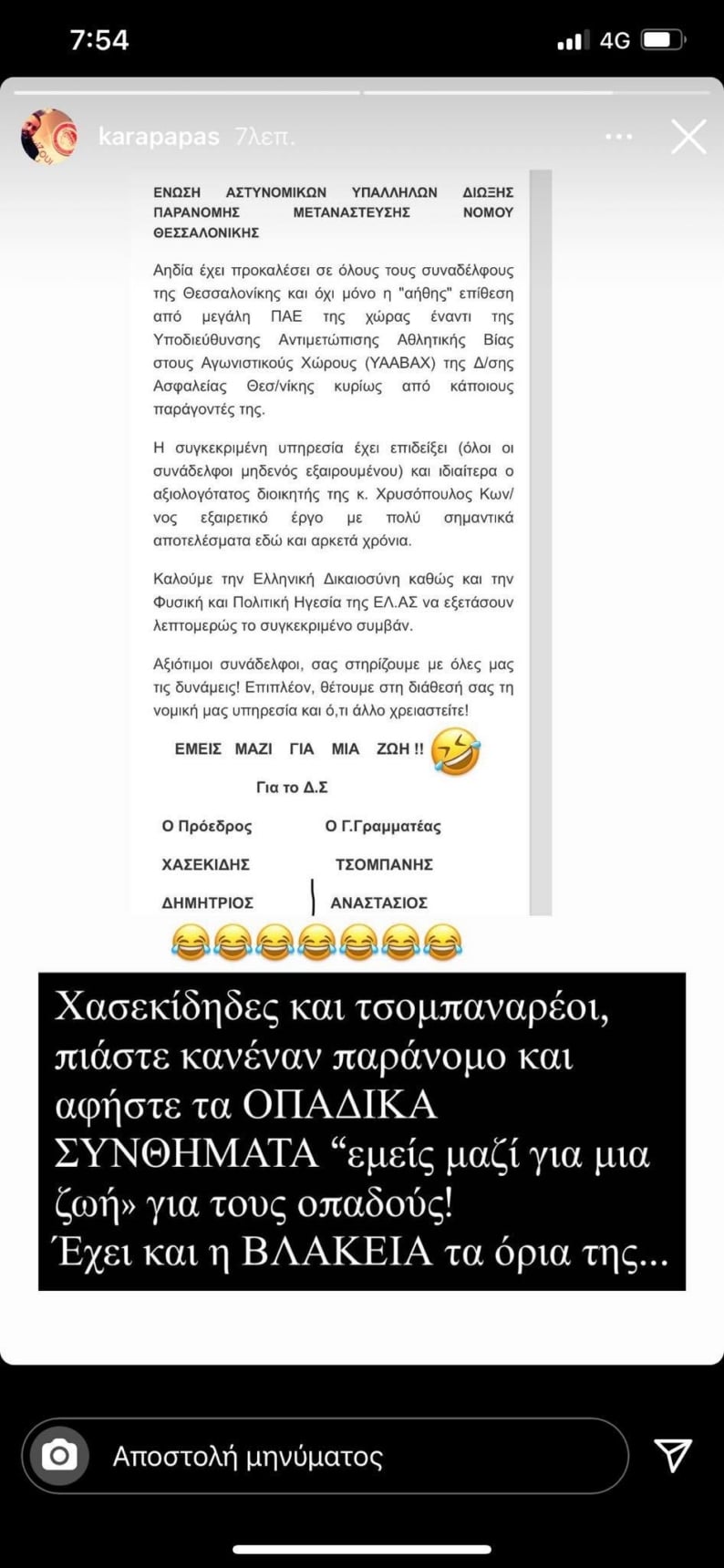 Καραπαπάς: «Έχει και η βλακεία τα όρια της…» (ΦΩΤΟ) 19/12/2020 Τα οπαδικά συνθήματα στην ανακοίνωση της Ένωσης Αστυνομικών Υπαλλήλων Δίωξης Παράνομης Μετανάστευσης Νομού Θεσσαλονίκης σχολίασε με στόρι του στο instagram ο αντιπρόεδρος της ΠΑΕ Ολυμπιακός, Κώστας Καραπαπάς. Δείτε την ανάρτησή του: ΔΙΑΒΑΣΤΕ ΕΠΙΣΗΣ