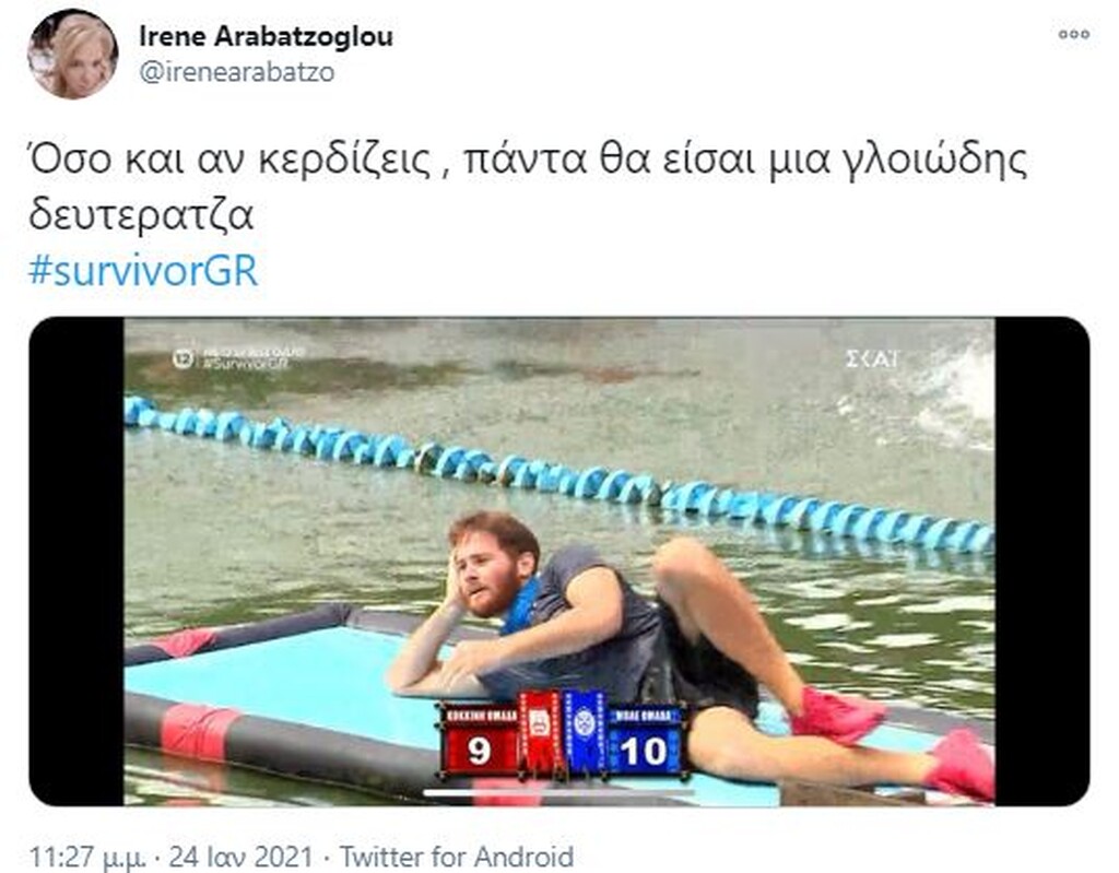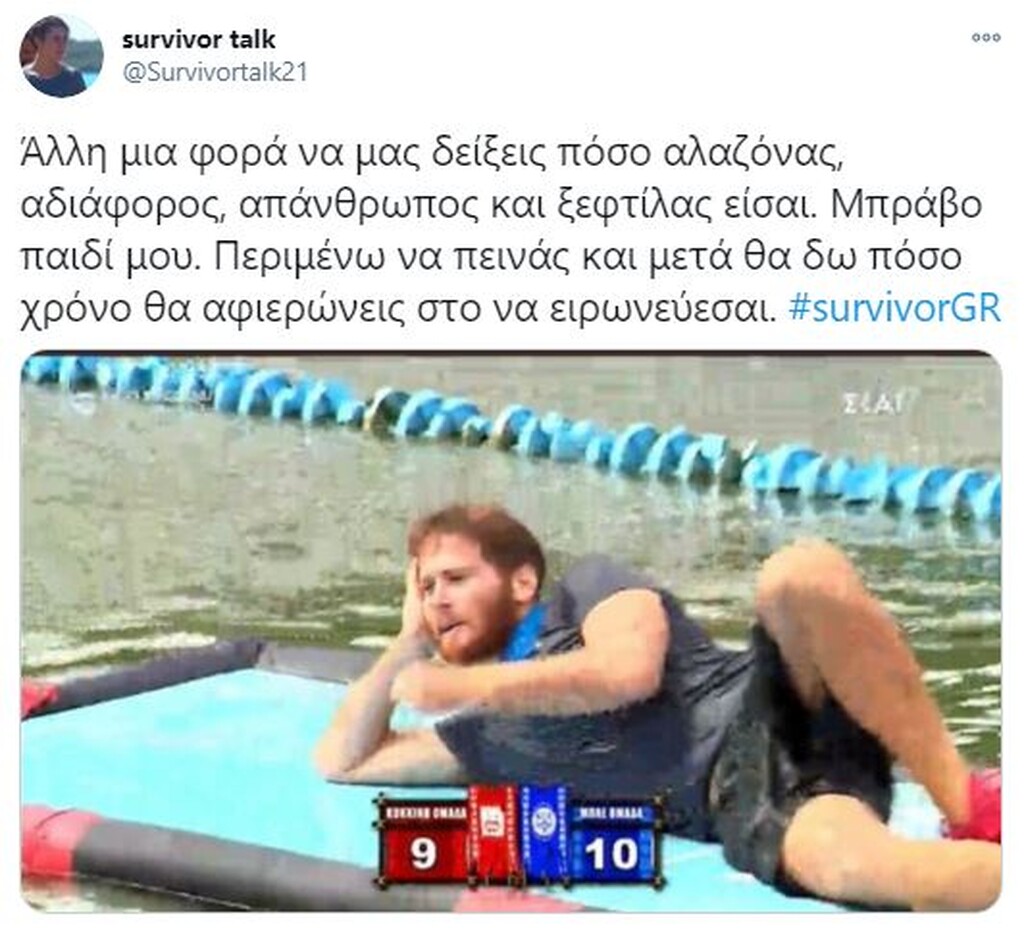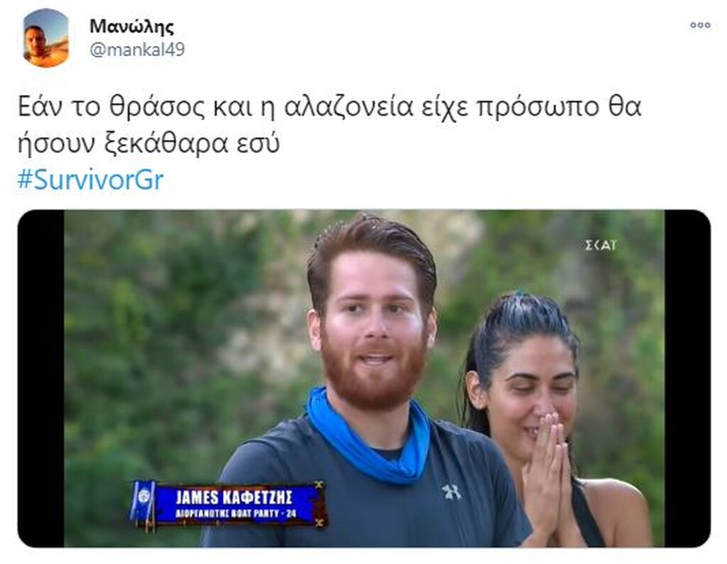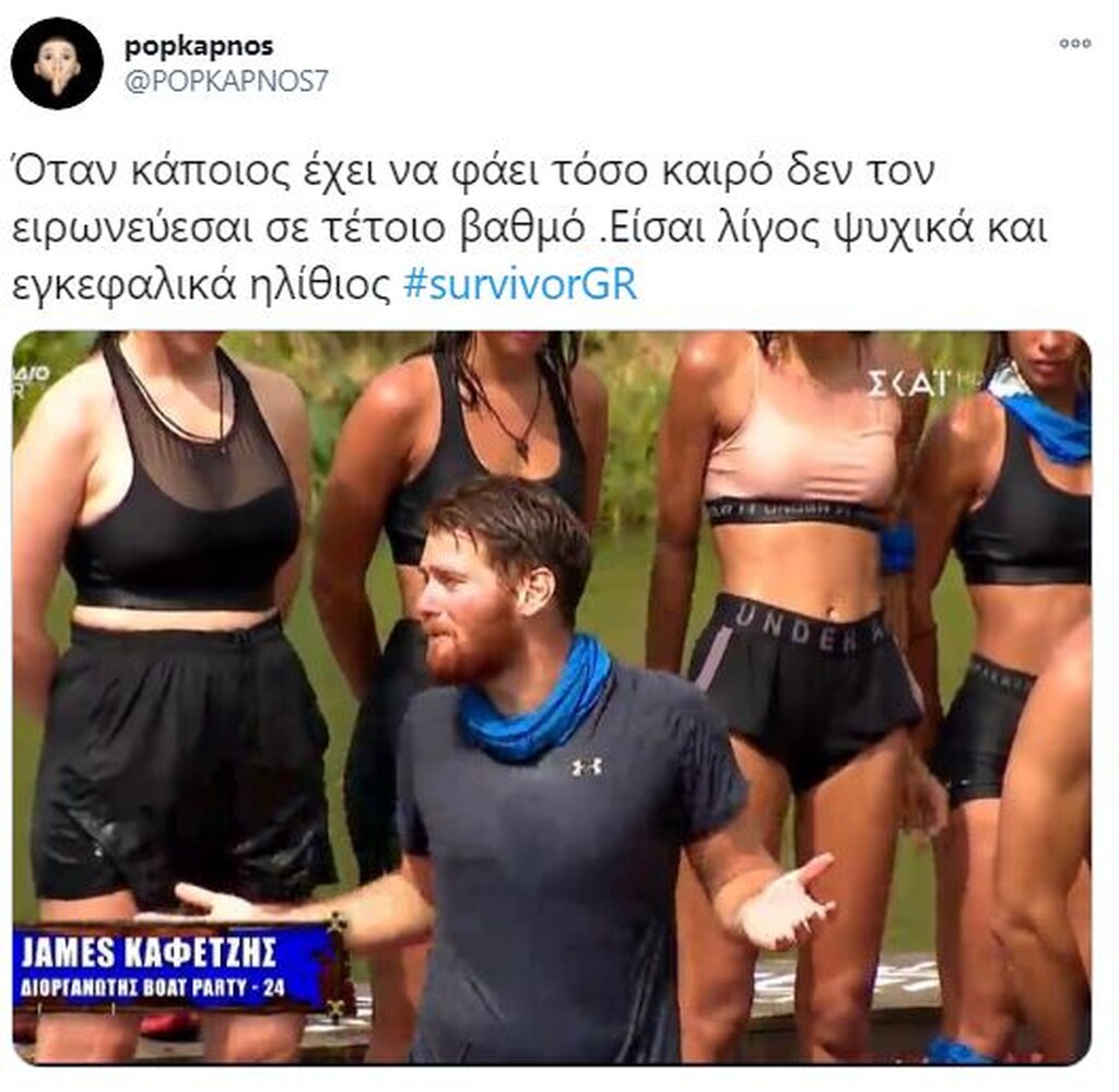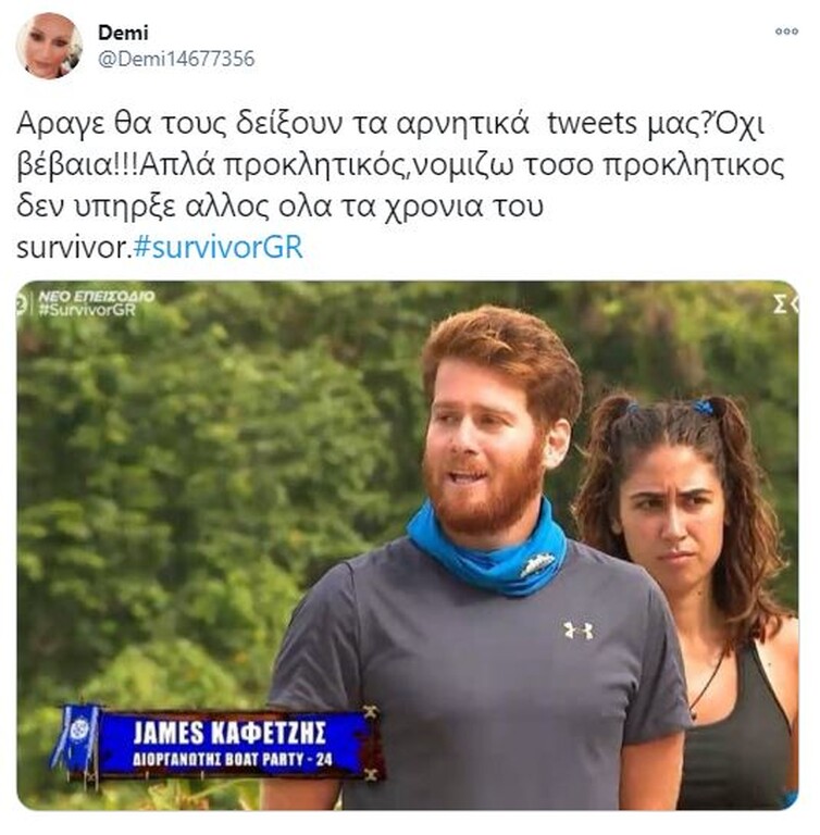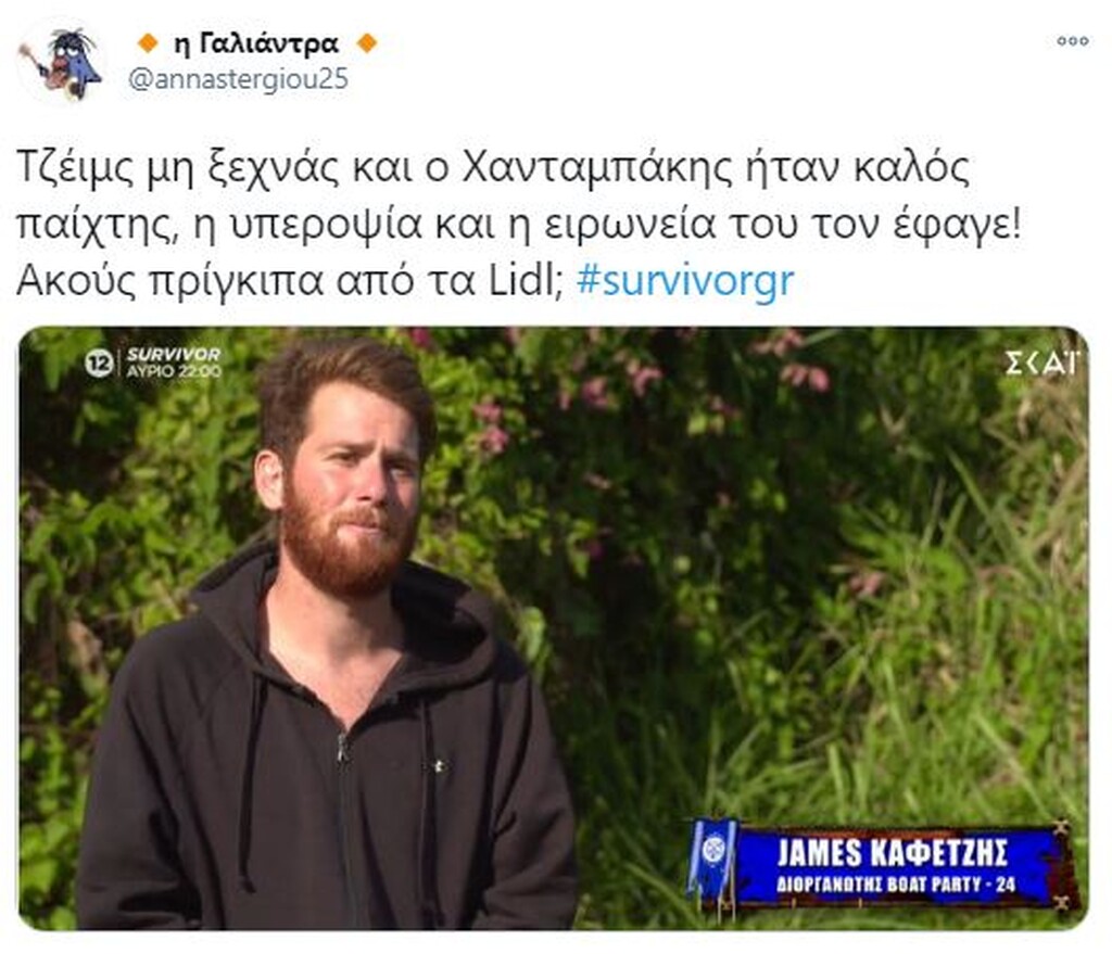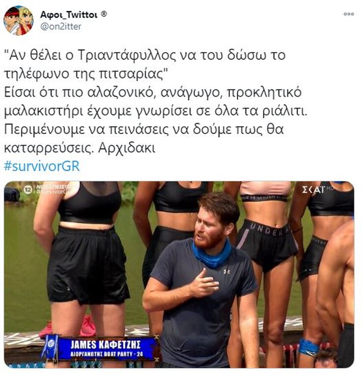 Survivor: Τρομερή επίθεση σε Τζέιμς στο Twitter – «Είσαι φίδι» (pics) 19/01/2021 Στο «στόχαστρο» των χρηστών του Twitter μπήκε ο Τζέιμς Καφετζής, ο οποίος δέχθηκε τρομερή επίθεση, λόγω των προκλητικών του δηλώσεων μετά τη νίκη της ομάδας του. Για μία ακόμα φορά, η μπλε ομάδα, που έχει δημιουργηθεί από τις επιλογές του Τζέιμς Καφετζή, κατάφερε να φτάσει στη νίκη στο στίβο «μάχης» που είχε στηθεί στο διάσημο ριάλιτι επιβίωσης. Μάλιστα, η νίκη ήρθε στο τέλος, όπου ο «αρχηγός» των μπλε, επικράτησε του Γιώργο Κοψιδά στον… τελικό. Έπαθλο ήταν μία πίτσα και μετά το τέλος του αγώνα, ο Τζέιμς Καφετζής θέλησε να πικάρει ακόμα περισσότερο τον Τριαντάφυλλο, με τον οποίο δεν έχει και τις καλύτερες σχέσεις, αλλά και τους «κόκκινους» για μία ακόμα φορά. Ωστόσο, οι ατάκες του αλλά και ο πανηγυρισμός του μετά το τελευταίο παιχνίδι, προκάλεσαν πολλά σχόλια στο Twitter. Πολλοί ήταν οι χρήστες που στράφηκαν εναντίον του, εξαπολύοντας μία τρομερή επίθεση. Δείτε τα καλύτερα «τιτιβίσματα»… ΔΙΑΒΑΣΤΕ ΕΠΙΣΗΣ