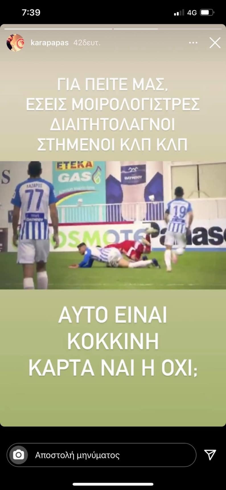 Καραπαπάς: «Αυτό είναι κόκκινη κάρτα, μοιρολογίστρες και στημένοι;» (ΦΩΤΟ) 25/01/2021 Ο αντιπρόεδρος της ΠΑΕ Ολυμπιακός, Κώστας Καραπαπάς, ξέσπασε κατά όσων προσπαθούν να βρουν διαιτητικά λάθη στο «διπλό» των Πειραιωτών στο Περιστέρι. Δείτε το χθεσινό ποστ του Καραπαπά για το ματς με τον Ατρόμητο: ΔΙΑΒΑΣΤΕ ΕΠΙΣΗΣ