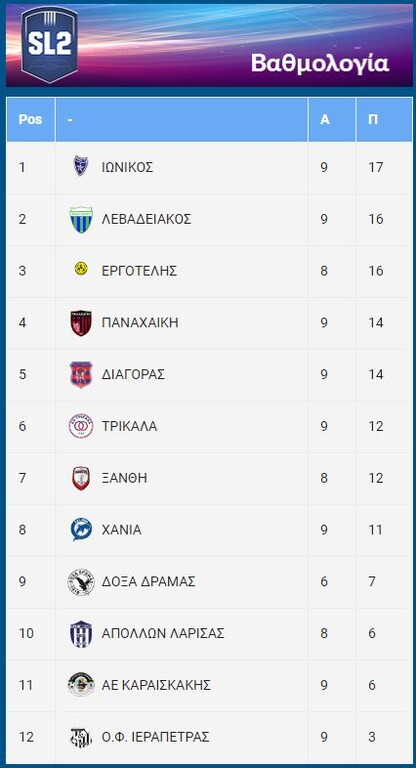Super League 2: Νέα γκέλα ο Λεβαδειακός, 2ος ο Εργοτέλης – Αποτελέσματα και βαθμολογία 17/02/2021 Τέλος στο νικηφόρο σερί του Ιωνικού έβαλε η Δόξα στη Δράμα, καθώς τον νίκησε με 2-1, σε παιχνίδι για την 9η αγωνιστική της Super League 2. Η ήττα δεν στοίχισε στους «κυανόλευκους» την κορυφή, καθώς ο Λεβαδειακός έμεινε στο 0-0 με τον Απόλλωνα Λάρισας. Ο Εργοτέλης συνέχισε να εντυπωσιάζει και νίκησε 1-0 τον ΟΦ Ιεράπετρας εκτός έδρας. Χανιά και Παναχαϊκή έμειναν στο 0-0, αν και έχασαν πολλές ευκαιρίες. Ο Καραϊσκάκης πανηγύρισε την πρώτη του νίκη φέτος, επικρατώντας 1-0 του ΑΟ Τρίκαλα. Στη Ρόδο, ο Διαγόρας επικράτησε 1-0 της Ξάνθης, η οποία φάνηκε επηρεασμένη από την… οδύσσεια να φτάσει εγκαίρως για το παιχνίδι. Τα αποτελέσματα της 9ης αγωνιστικής: Δόξα Δράμας – Ιωνικός 2-1 (22′ Άντερσον, 74′ Αγγελόπουλος / 81′ Ρόλε) ΟΦ Ιεράπετρας – Εργοτέλης 0-1 (5′ Μπουτσάκης) Καραϊσκάκης – Τρίκαλα 1-0 (45+1′ Γιαννιώτης) Χανιά – Παναχαϊκή 0-0 Διαγόρας – Ξάνθη 1-0 (48′ Αλάεζ) Λεβαδειακός – Απόλλων Λάρισας 0-0 ΔΙΑΒΑΣΤΕ ΕΠΙΣΗΣ