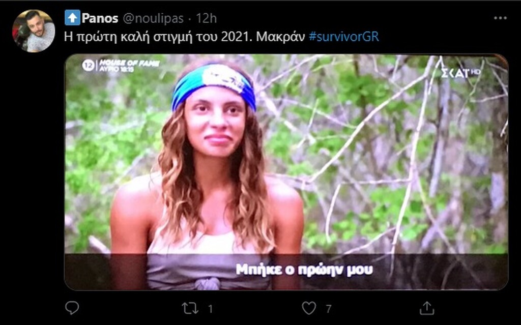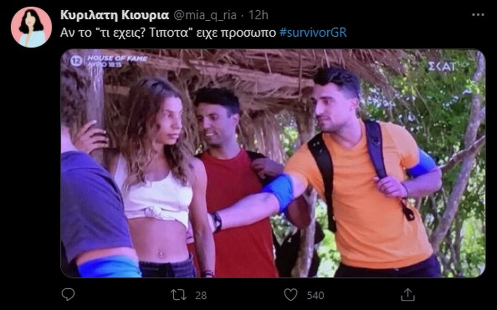 «Σκάνε τρεις καινούργιοι παίκτες και τους δύο τους ήξερα θέλοντας και μη… Το Survivor είναι το παιχνίδι των ανατροπών και μας το ξεκαθαρίζει γι’ άλλη μια φορά. Τι να πω, μπήκε ο πρώην μου από εκεί που δεν το περίμενα. Ένας άνθρωπος που έχω ζήσει μια ιστορία στο παρελθόν. Δυο μήνες που είμαστε εδώ δεν περίμενα να τον δω», ανέφερε αρχικά.