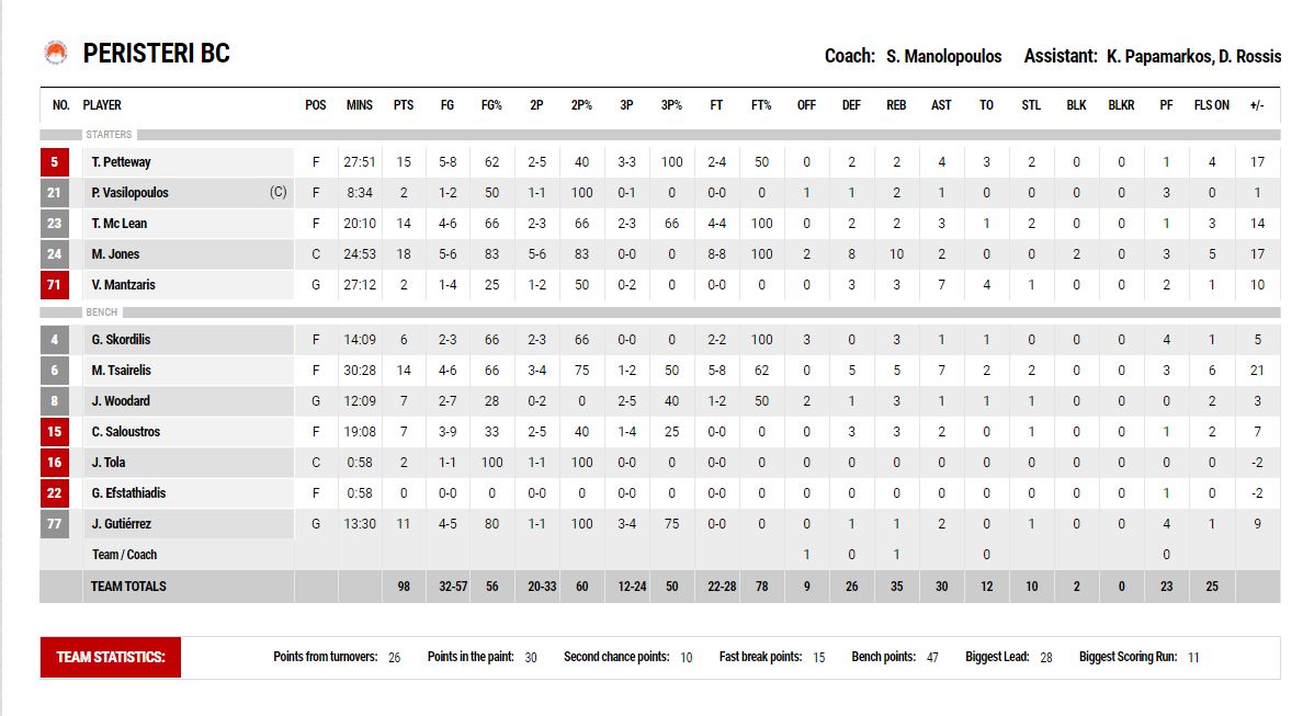 «Περίπατος» για το Περιστέρι στη Λάρισα 28/03/2021 Το Περιστέρι έδωσε ρεσιτάλ στη Λάρισα, έπαιξε ολοκληρωτικό μπάσκετ, κυριάρχησε πλήρως και πέτυχε μια εύκολη εκτός έδρας νίκη με 98-78. Οι φιλοξενούμενοι άρχισαν «ζεστοί» και με 3/5 τρίποντα, προηγήθηκαν με18-8 στο 6’. Αν και η Λάρισα μείωσε σε 20-15, το Περιστέρι έκλεισε το πρώτο δεκάλεπτο στο +9 (σκορ 26-17). Το Περιστέρι συνέχισε να σκοράρει και βρέθηκε μπροστά στο σκορ με 30-17 στις αρχές της δεύτερης περιόδου και με 43-27 στο 15’, με τον Τεράν Πέτεγουεϊ να έχει 12 πόντους. Οι φιλοξενούμενοι συνέχισαν να παίζουν πολύ καλό μπάσκετ κι έφτασαν στο 52-29 στο 18’30’’. Η Λάρισα απλώς μείωσε σε 54-35 στο τέλος του πρώτου ημιχρόνου. Το Περιστέρι είχε πάρει ένα μεγάλο προβάδισμα και το συντηρούσε στην τρίτη περίοδο. Παρά το γεγονός ότι η Λάρισα βρήκε καλύτερο επιθετικό ρυθμό και με τον Παπαδάκη να φτάνει τα 4/4 τρίποντα και τους 16 πόντους. Στο 27’ το σκορ ήταν 70-53 για την ομάδα του Σωτήρη Μανωλόπουλου. Με τον Γκουτιέρες να παίρνει τη σκυτάλη και να εχει επιθετικό κρεσέντο, το Περιστέρι ξέφυγε 88-60 στο 32’30’’ και καπού εκεί κρίθηκε το ματς. Δεκάλεπτα: 17-26, 35-54, 58-77, 78-98 ΔΙΑΒΑΣΤΕ ΕΠΙΣΗΣ
