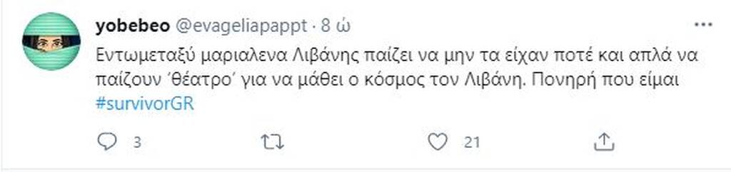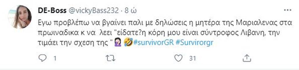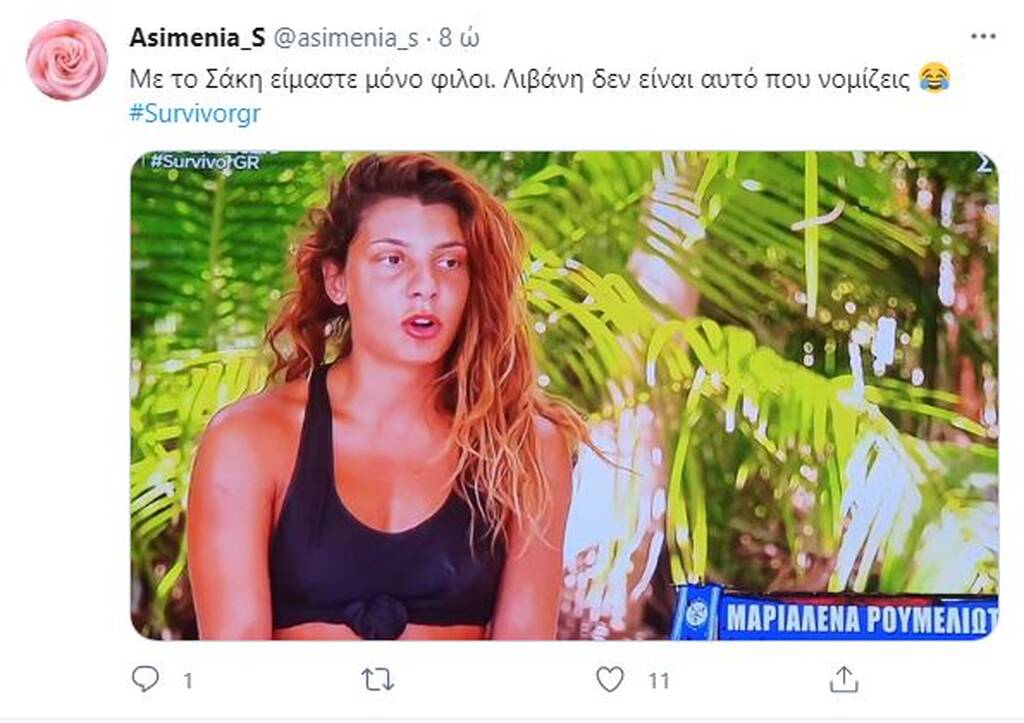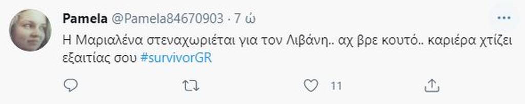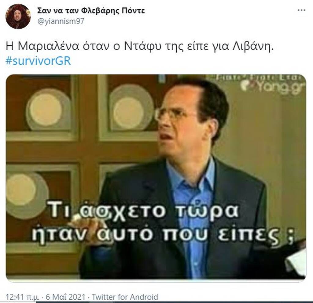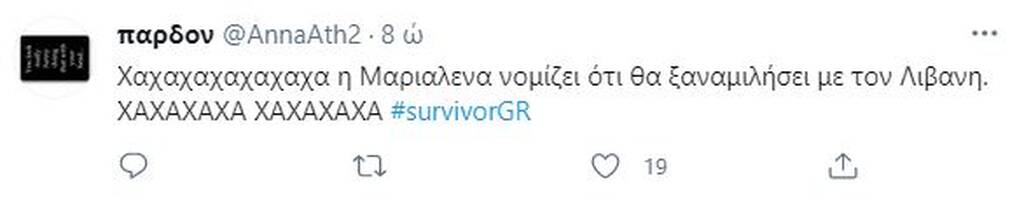 Survivor: Άγριο γλέντι στο Twitter για Μαριαλένα και Λιβάνη – «Που τα πουλάς αυτά;» (pics) 05/05/2021 Επικό… κράξιμο στη Μαριαλένα από τους χρήστες του Twitter μετά την απορία της για την απουσία μηνύματος του Γιώργου Λιβάνη. Οι «Μπλε» ήταν οι νικητές στο έπαθλο επικοινωνίας στο τελευταίο επεισόδιο του Survivor και είχαν την ευκαιρία να δουν μηνύματα από τους φίλους τους και τα αγαπημένα τους πρόσωπα. Όπως είναι λογικό, το έπαθλο κέρδισε και η Μαριαλένα που περίμενε ένα μήνυμα από τον Γιώργο Λιβάνη. Ωστόσο, η Ελληνίδα αθλήτρια δεν είδε τον νεαρό τραγουδιστή με αποτέλεσμα να στεναχωρηθεί. Όμως, δεν θέλησε να το κρατήσει για τον εαυτό της, αλλά το είπε μπροστά στις κάμερες, εκφράζοντας τον προβληματισμό της που ο Γιώργος Λιβάνης δεν θέλησε να της στείλει ένα μήνυμα στον Άγιο Δομίνικο. Μάλιστα, σύμφωνα με τα όσα υποστήριξε στην κάμερα, η σχέση της με τον Σάκη Κατσούλη έχει παρεξηγηθεί, μια και δεν υπάρχει κάτι το ερωτικό, παρά τα πλάνα που έρχονται από την παραλία του Survivor και τους δείχνει να έχουν έρθει και πάλι πάρα πολύ κοντά. Πάντως, οι ατάκες της Μαριαλένας όταν εξέφρασε την απορία της για την απουσία του μηνύματος από τον Έλληνα τραγουδιστή προκάλεσαν ένα τρομερό… γλέντι στο Twitter. ΔΙΑΒΑΣΤΕ ΕΠΙΣΗΣ