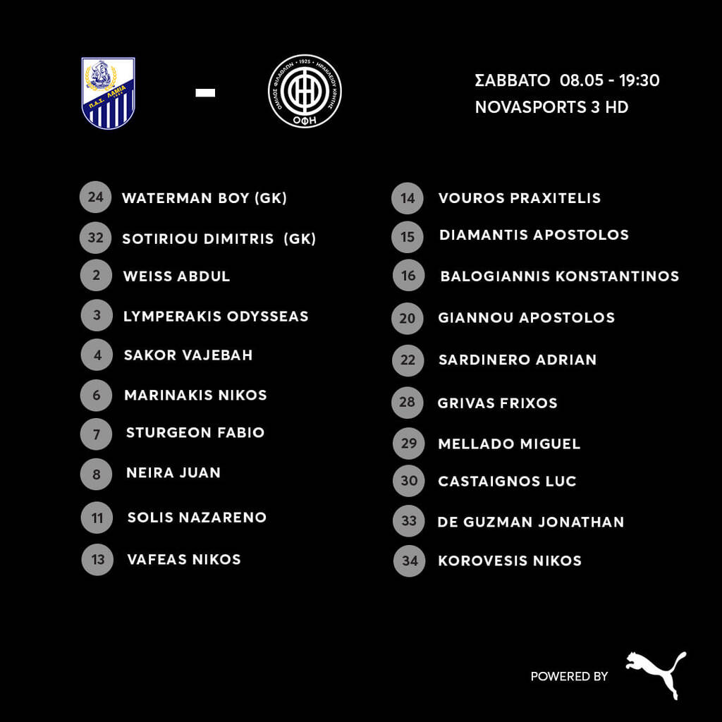 Την 20μελή αποστολή του ΟΦΗ απαρτίζουν οι Βάτερμαν, Σωτηρίου, Ουές, Λυμπεράκης, Σακόρ, Μαρινάκης, Στάρτζεον, Νέιρα, Σολίς, Βαφέας, Βούρος, Διαμαντής, Μπαλογιάννης, Γιάννου, Σαρδινέρο, Γρίβας, Μεγιάδο, Καστάνιος, Ντε Γκούζμαν και Κοροβέσης.