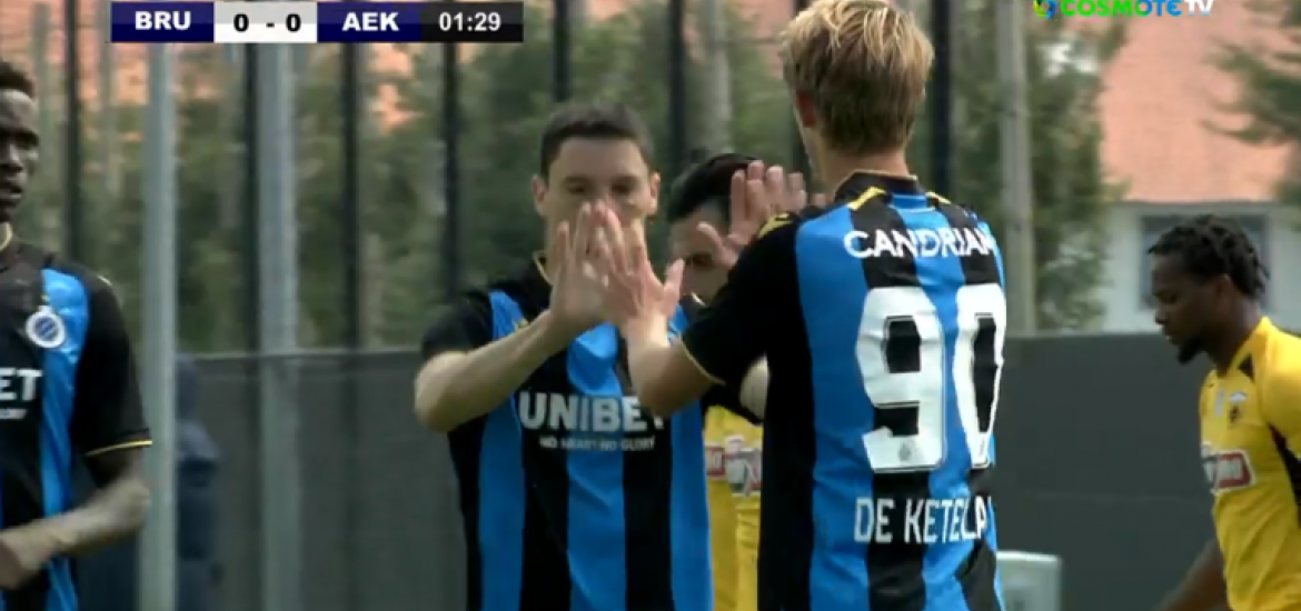 Σε κόρνερ των Βέλγων, η άμυνα της ΑΕΚ έχασε την πρώτη κεφαλιά, ο Ντοστ την έστειλε στο δεύτερο δοκάρι και εκεί σε κενή εστία ο Ντε Κέτελερ την έστειλε στα δίχτυα της ομάδας του Βλάνταν Μιλόγεβιτς για το 1-0.