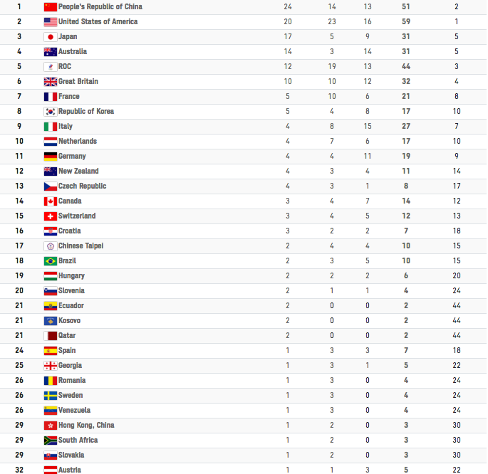 Ολυμπιακοί Αγώνες: Η μάχη των μεταλλίων 01/08/2021 Η μάχη των μεταλλίων συνεχίζεται στο Τόκιο. Η Κίνα έχει 24 χρυσά και 51 στο σύνολο, ενώ η Ιαπωνία με 17 χρυσά και 31 στο σύνολο…έπεσε στην τρίτη θέση του πίνακα, αφού πέρασαν στη δεύτερη θέση οι ΗΠΑ (20 χρυσά και 59 σύνολο). Η Ελλάδα φυσικά βρίσκεται πλέον στον πίνακα των μεταλλίων (47η), με το χρυσό από τον Στέφανο Ντούσκο στο σκιφ της κωπηλασίας. ΔΙΑΒΑΣΤΕ ΕΠΙΣΗΣ