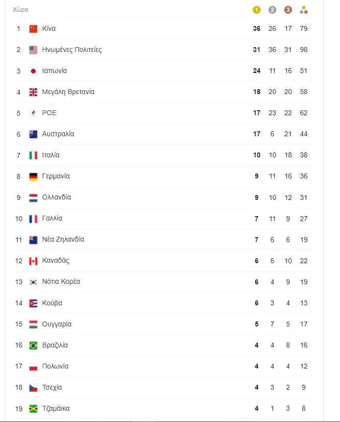 Ολυμπιακοί Αγώνες: ο πίνακας των μεταλλίων 06/08/2021 Η Κίνα προηγείται στη μάχη των μεταλλίων στους Ολυμπιακούς Αγώνες 2020 που διεξάγονται στο Τόκιο. Συγκεκριμένα έχει 36 χρυσά και 79 στο σύνολο. Ακολουθούν οι ΗΠΑ με 31 χρυσά μετάλλια, αλλά περισσότερα συνολικά (98), ενώ η Ιαπωνία μετράει 24 χρυσά και 51 στο σύνολο. Η Ελλάδα βρίσκεται πλέον στον πίνακα (36η) με τρία μετάλλια ΔΙΑΒΑΣΤΕ ΕΠΙΣΗΣ