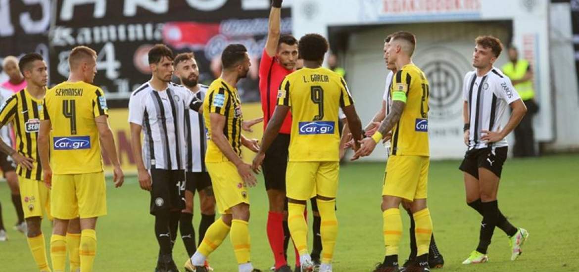 Έντονες διαμαρτυρίες των «κιτρινόμαυρων» στον Φωτιά! «Έχεις διαλύσει το ματς!» 19/09/2021 Μεγάλη ένταση στο «Γεντί Κουλέ» στη διάρκεια και στην ανάπαυλα του παιχνιδιού του ΟΦΗ με την ΑΕΚ! Αρχικά υπήρξε επεισόδιο στα επίσημα του γηπέδου με τον Παναγιώτη Κονέ, ο οποίος, επειδή πανηγύρισε το 2-0 από τον Τσούμπερ, δέχθηκε… πέσιμο από οπαδούς της κρητικής ομάδας, ωστόσο η κατάσταση ηρέμησε. Στη συνέχεια ο Βασίλης Δημητριάδης δέχθηκε κίτρινη κάρτα από τον διαιτητή Φωτιά, καθώς με το που έληξε το ημίχρονο διαμαρτυρήθηκε στον ρέφερι στο κέντρο του γηπέδου τόσο για την αποβολή του Λιβάι Γκαρσία όσο και για την αποβολή που δεν έδωσε στο χτύπημα του Χατζισαφί. Υπήρξε και συνέχεια, όμως, αφού ο Φωτιάς δέχθηκε έντονες διαμαρτυρίες στο ημίχρονο από τους ανθρώπους της ΑΕΚ, με το που μπήκε στα αποδυτήρια. «Δεν σέβεσαι την ΑΕΚ, έχεις διαλύσει το ματς», ήταν αυτά που ακούστηκαν μεταξύ άλλων. ΔΙΑΒΑΣΤΕ ΕΠΙΣΗΣ