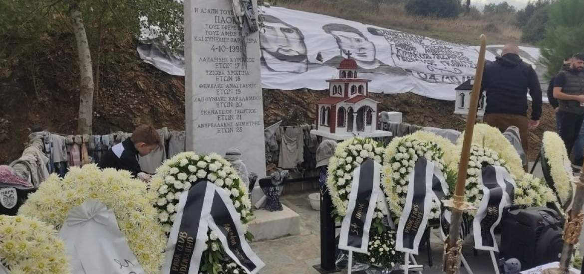 Τέμπη: Τίμησε τη μνήμη των αδικοχαμένων οπαδών του ο ΠΑΟΚ (ΦΩΤΟ) 03/10/2021 Ιδιαίτερη η σημερινή μέρα για τον ΠΑΟΚ που τίμησε τη μνήμη των έξι φίλων του που έχασαν τη ζωή τους στα Τέμπη πριν από 22 χρόνια. Το νήμα της ζωής για τους Χαράλαμπο Ζαπουνίδη( 20 ετών), Δημήτρη Ανδρεαδάκη (25 ετών), Χριστίνα Τζιόβα (18 ετών), Αναστάσιο Θέμελη (22 ετών), Γεώργιο Γκανάτσιο (22 ετών) και Κυριάκο Λαζαρίδη ( 17 ετών) έμελλε να κοπεί στις 4 Οκτωβρίου του 1999, όταν το λεωφορείο, που τους μετέφερε μαζί με άλλους οπαδούς του ΠΑΟΚ, επέστρεφε στη Θεσσαλονίκη, μετά τον αγώνα με τον Παναθηναϊκό στην Αθήνα. Το λεωφορείο κατά την προσπέραση οχήματος, μπήκε στο αντίθετο ρεύμα και συγκρούστηκε με διερχόμενο φορτηγό, λίγο πριν τα Τέμπη. Μέλη των τμημάτων του Δικεφάλου του Βορρά βρέθηκαν σήμερα το πρωί για το ετήσιο μνημόσυνό τους, στο σημείο που υπάρχει το μνημείο και απέτισαν φόρο τιμής. Στεφάνια απέστειλαν η ΠΑΕ ΠΑΟΚ, ο Ιβάν Σαββίδης, ο Ερασιτέχνης ΠΑΟΚ, η ΚΑΕ ΠΑΟΚ, καθώς και αρκετοί σύνδεσμοι του Δικεφάλου του Βορρά, ενώ το παρών μεταξύ άλλων έδωσαν οι Θανάσης Χατζόπουλος, Βασίλης Τριλυράκης, Κυριάκος Αλεξανδρίδης, Δημήτρης Χασεκίδης, Ίνγκι Ίνγκασον και Ομάρ Ελ Καντουρί. Οι φίλοι της ομάδας της Θεσσαλονίκης, που έδωσαν το «παρών», φώναξαν «αδέρφια, ζείτε, εσείς μας οδηγείτε». ΔΙΑΒΑΣΤΕ ΕΠΙΣΗΣ