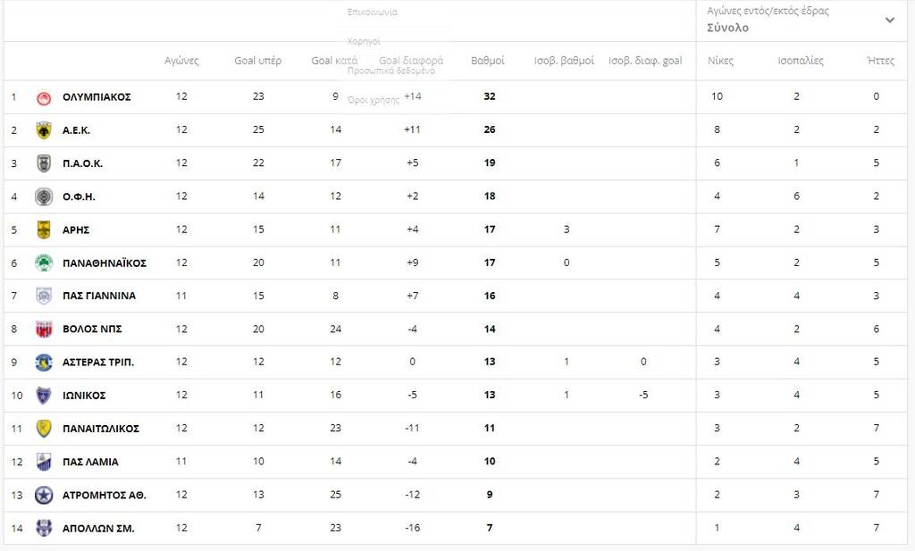 Τα αποτελέσματα και το πρόγραμμα της 12ης αγωνιστικής: