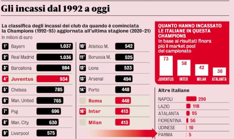Champions League: Αυτή είναι η… βασίλισσα της διοργάνωσης – Πακτωλός εκατομμυρίων στα ταμεία της ομάδας 15/02/2022 Η Μπάγερν είναι η ομάδα που έχει κερδίσει τα περισσότερα χρήματα στην Ιστορία του Champions League. Aπό τη σεζόν 1992-93, όταν το -παλιό- Κύπελλο Πρωταθλητριών έγινε Champions League, έως την ολοκλήρωση της περασμένης, 2020-21, οι Βαυαροί έχουν βάλει στα ταμεία τους 1,037 δισεκατομμύρια ευρώ. Μονάχα μία ακόμα ομάδα έχει ξεπεράσει το δισεκατομμύριο σε αυτό το χρονικό διάστημα, η Ρεάλ Μαδρίτης, που με 1,036 δισ. ευρώ βρίσκεται στην δεύτερη θέση της σχετικής κατάταξης. Το βάθρο, όπως αναφέρει σε σχετικό της δημοσίευμα η ιταλική αθλητική εφημερίδα «Gazzetta delllo Sport» , ολοκληρώνει η Μπαρτσελόνα με 984 εκατομμύρια ευρώ. Συνολικά αυτά τα χρόνια η κορυφαία διοργάνωση συλλόγων στον πλανήτη έχει μοιράσει περισσότερα από 20 δισεκατομμύρια ευρώ. Το Champions League έχει έσοδα περίπου 3,5 δισ. ανά σεζόν και μοιράζει το 58% στις φιναλίστ (2 δισ.), ένα 20% πηγαίνει στο Europa League και στο Conference και το υπόλοιπο 22% χρησιμοποιείται για την κάλυψη εξόδων και για την αλληλεγγύη στο ποδόσφαιρο. Έως τη σεζόν 2023-24, θα συνεχιστεί το σύστημα με 32 ομάδες και 8 ομίλους. Από το 2024 όμως αλλάζει. Η φόρμουλα είναι αυτή που εγκρίθηκε πέρυσι, μετά τη νύχτα της ευρωπαϊκής Super League (ESL) και περιλαμβάνει 36 φιναλίστ, μία μόνο κατάταξη, 10 παιχνίδια στη φάση των ομίλων (αλλά θα μειωθούν), με τις πρώτες οκτώ ομάδες στον δεύτερο γύρο και play off για να αποφασίσουν οι άλλες οκτώ. Όπως, πριν από λίγες ημέρες, διέρρευσε η ECA (ευρωπαϊκή ένωση συλλόγων) οδεύουμε προς τερατώδη έσοδα 5 δισεκατομμυρίων ετησίως για την τριετία 2024-27 (+ 40%), κάτι που σημαίνει ότι οι σύλλογοι δεν θα πάρουν λιγότερο από 3 δισ ευρώ. Μια κίνηση μέσων ενημέρωσης που χρησιμεύει για την καταπολέμηση της… επιστροφή της ESL. ΔΙΑΒΑΣΤΕ ΕΠΙΣΗΣ